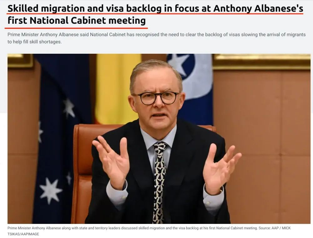 總理安東尼·阿爾巴尼斯(Anthony Albanese)表示:國家內閣已經認識到有必要清理積壓的簽證申請,并需要引入更多移民,以幫助填補澳洲技能短缺的問題。目前,一些簽證申請人已經等待了12~18 個月??偫泶饲熬捅硎具^,他已經意識到簽證積壓問題的嚴重性,并已經要求內政部中負責其他職能的人員加入到清理簽證積壓的工作之中(Albanese sayshe has directed the Department of Home Affairs to move people from other duties into clearing the visa backlog.),以加快簽證處理進程。