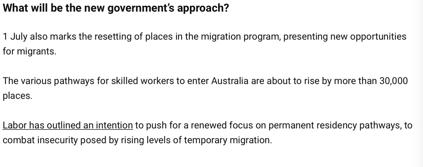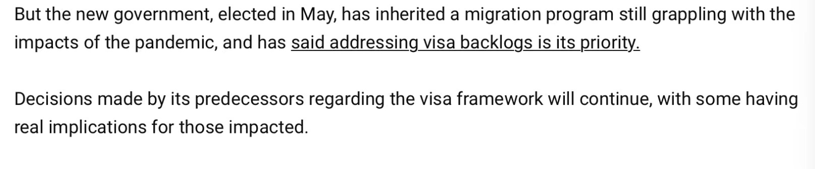 工黨已概述一項意圖,即推動重新關注永久居留途徑,以應對臨時移民水平上升所帶來的不安全感。5月剛上任的新政府目前面對的還是一個為應對COVID-19疫情而設置的移民計劃,解決簽證積壓問題是其首要任務。