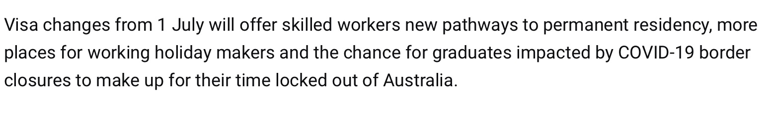 新財年起的簽證變更不僅將為技術工人提供獲得永久居留權的新途徑,還能為工作度假的人提供更多場所,并為受COVID-19邊境關閉影響的畢業生提供機會,彌補他們無法在澳大利亞國境內的時間。