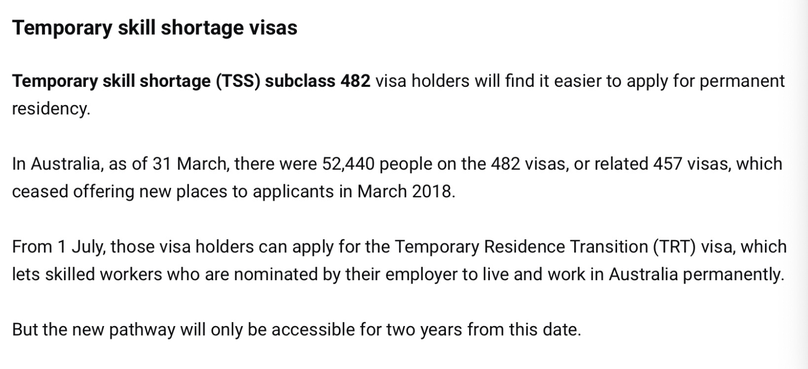 從7月1日起,這些簽證持有者可以申請臨時居留過渡簽證(TRT),該簽證允許由雇主提名的技術工人在澳大利亞永久生活和工作。但從該日期起,新途徑只能在兩年內使用。