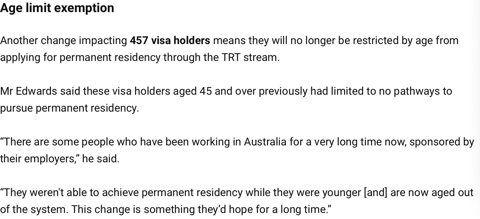 影響457簽證持有人的另一項變化意味著,在通過TRT申請永久居留權時,他們將不再受年齡限制。據Work Visa助理律師愛德華茲介紹,這些45歲及以上的簽證持有者以前并沒有途徑獲得永久居留權。