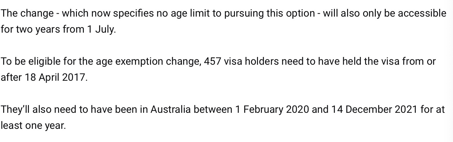需要注意的是,這一豁免年齡限制的調整,也僅限在7月1日開始后的兩年內有效。457簽證持有人需要在2017年4月18日或之后持有簽證,才有資格享受年齡豁免變更。此外,申請人還需要在2020年2月1日至2021年12月14日期間在澳大利亞居住至少一年。