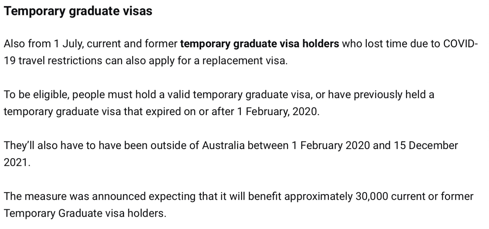 從7月1日開始,由于新冠肺炎疫情旅行限制而耽誤時間的現有及原有臨時畢業生簽證持有人,也可以申請更換簽證。要獲得資格,申請人必須持有有效的臨時畢業生簽證,或者之前持有在2020年2月1日或之后到期的臨時畢業生簽證。此外,申請人還必須在2020年2月1日至2021年12月15日期間在澳大利亞境外生活。