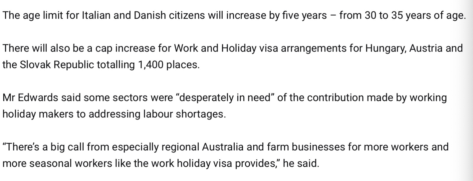 但從7月1日開始,作為462簽證安排的一部分,來自多個國家的打工度假者名額將增加30%,但這一名額上調措施僅適用于2022-23年期間。