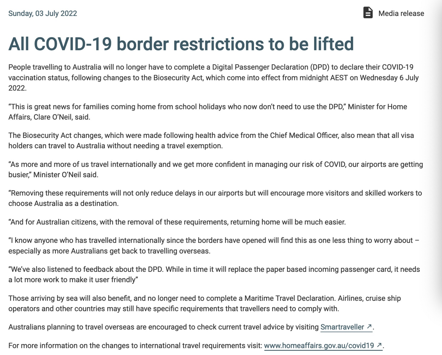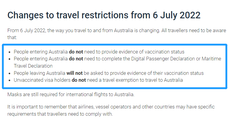 移民局之前關(guān)于入境疫苗和檢測要求的頁面昨晚也已經(jīng)做出更新,表示從7月6日開始:入境澳洲不再要求提供疫苗證明;不再要求填寫DPD或MTD;