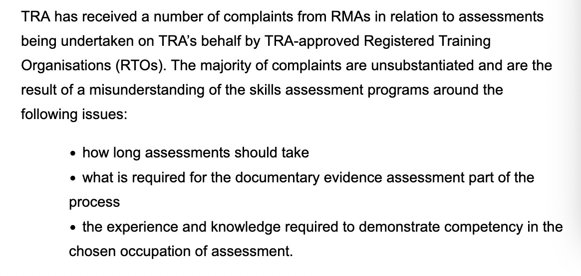 TRA近期收到了一些RMA的投訴,涉及到由TRA批準(zhǔn)的注冊(cè)培訓(xùn)機(jī)構(gòu)(RTO)代表TRA進(jìn)行的評(píng)估。大多數(shù)的投訴都是未經(jīng)證實(shí)的,是由于對(duì)以下問(wèn)題的技能評(píng)估的誤解造成的: