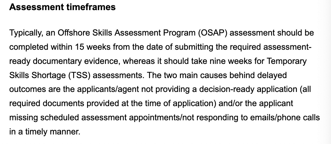 通常情況下,離岸技能評(píng)估項(xiàng)目(OSAP)評(píng)估應(yīng)在提交所需的評(píng)估準(zhǔn)備文件證據(jù)之日起15周內(nèi)完成,而臨時(shí)技能短缺(TSS)評(píng)估則需要花費(fèi)9周時(shí)間。延遲的兩個(gè)主要原因分別是:一,申請(qǐng)人/代理人沒(méi)有提供可供決策的申請(qǐng)(在申請(qǐng)時(shí)提供所有必需文件);二,申請(qǐng)人錯(cuò)過(guò)預(yù)定的評(píng)估預(yù)約或是沒(méi)有及時(shí)回復(fù)電子郵件和電話。