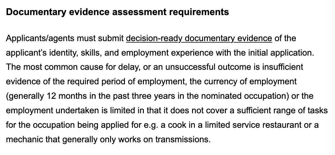 申請(qǐng)人/代理機(jī)構(gòu)必須在初次申請(qǐng)時(shí)提交可供決策的書(shū)面證明,以證明申請(qǐng)人的身份、技能和就業(yè)經(jīng)歷。延誤或不成功的最常見(jiàn)原因是沒(méi)有足夠的證據(jù)證明所需的就業(yè)時(shí)間,就業(yè)時(shí)間(一般是在過(guò)去三年中的12個(gè)月的指定職業(yè))或所從事的就業(yè)是有限的,沒(méi)有涵蓋所申請(qǐng)的職業(yè)的足夠范圍的任務(wù),例如,在一個(gè)服務(wù)有限的餐廳的廚師或通常只在變速器上工作的技工。