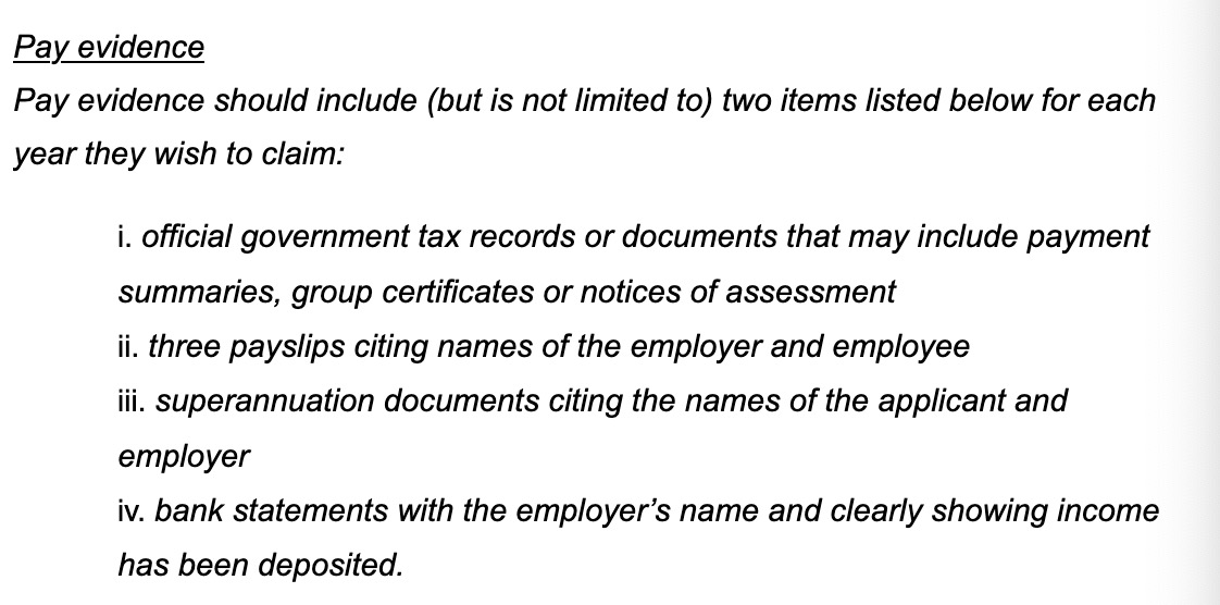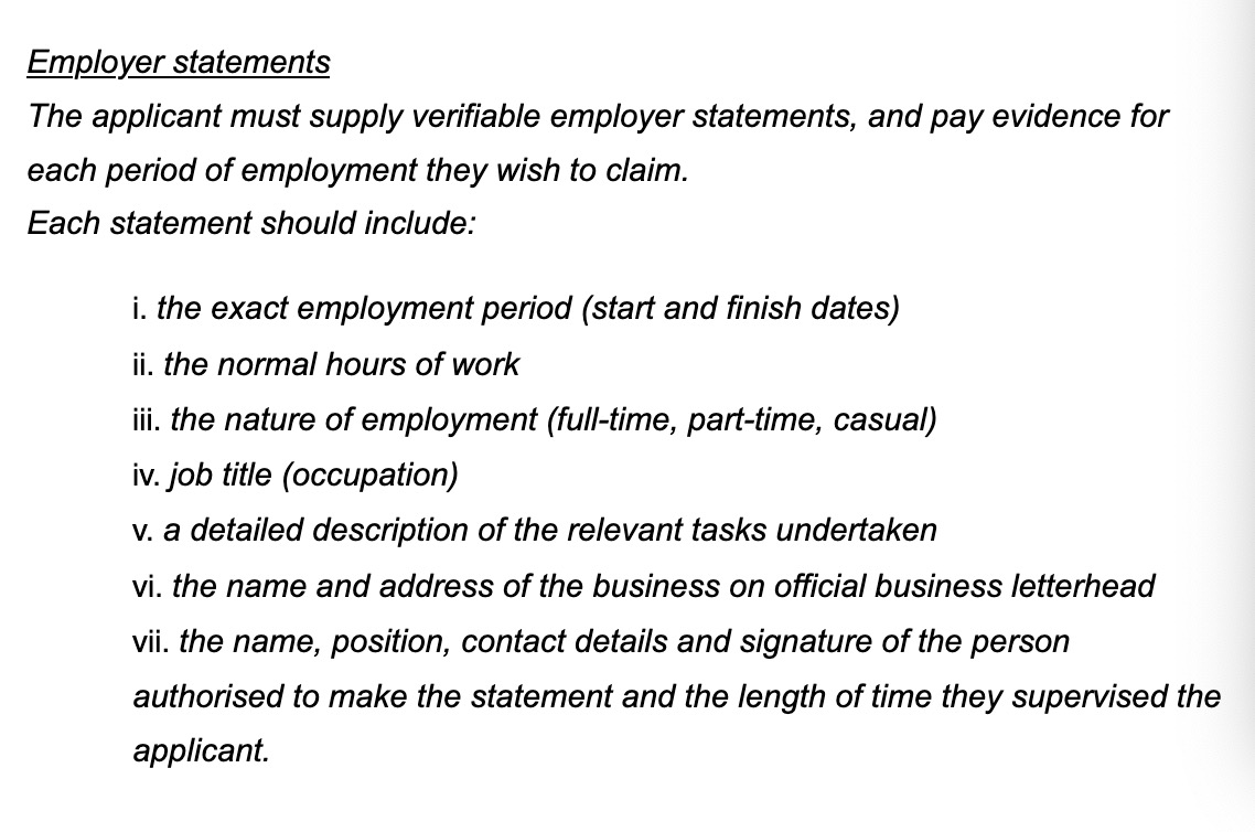 申請(qǐng)人必須提供可核實(shí)的雇主聲明,以及他們希望申請(qǐng)的每段工作的工資證明。每份聲明應(yīng)包括: