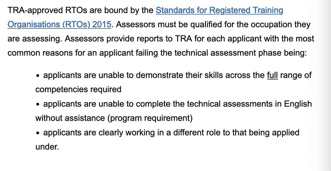 TRA批準(zhǔn)的RTO受2015年注冊(cè)培訓(xùn)機(jī)構(gòu)(RTO)標(biāo)準(zhǔn)的約束。評(píng)估員必須具備他們所評(píng)估職業(yè)的資格。評(píng)估員向TRA提供每個(gè)申請(qǐng)人的報(bào)告,申請(qǐng)人未能通過(guò)技術(shù)評(píng)估階段的最常見(jiàn)原因如下: