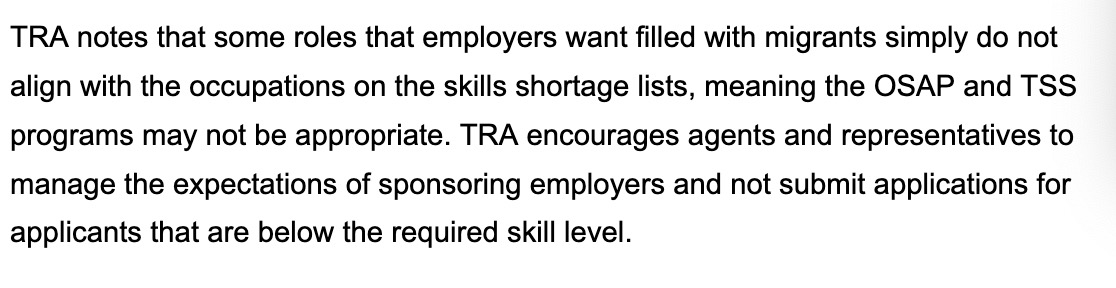 TRA指出,雇主希望由移民填補(bǔ)的一些角色與技能短缺名單上的職業(yè)不一致,這意味著OSAP和TSS計(jì)劃可能不合適。TRA鼓勵(lì)代理人和代表管理贊助雇主的期望,不要為低于所需技能水平的申請(qǐng)人提交申請(qǐng)。