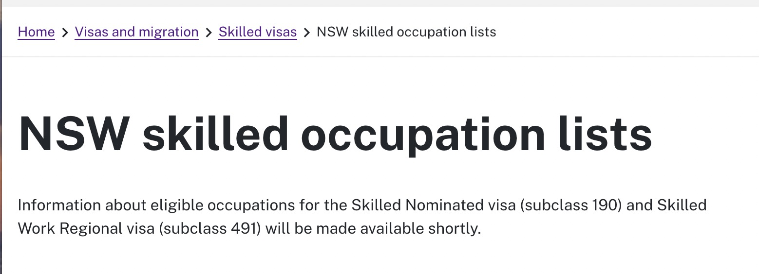 從新州的官網上來看,進入新財年后新州暫時關閉了職業列表,官網公告稱對于190簽證和491簽證的合格職業列表將很快公布。預計是對職業和職業的具體要求和限制作出調整。
