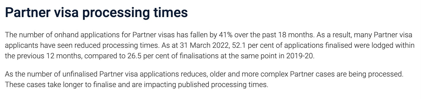 在過(guò)去18個(gè)月里,現(xiàn)有的配偶簽證申請(qǐng)數(shù)量下降了41%。因此,許多配偶移民簽證申請(qǐng)人的處理時(shí)間縮短了。截至2022年3月31日,52.1%的最終申請(qǐng)是在過(guò)去12個(gè)月內(nèi)提交的,而在2019-20年的同一時(shí)間點(diǎn),這一比例為26.5%。