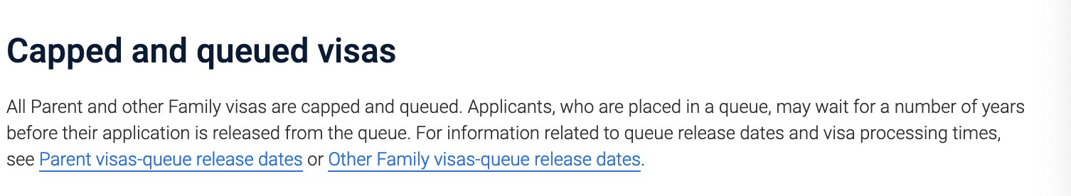 所有父母和其他家庭簽證都有上限并需要排隊(duì)等候。被排在隊(duì)列中的申請(qǐng)人,可能要等上好幾年才能從隊(duì)列中釋放。相關(guān)信息可參閱parent visas-queue release dates或other family visas-queue release dates。
