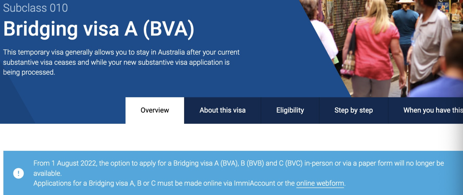 從2022年8月1日起,將不再提供親臨現場或通過紙質表格申請過橋簽證A(BVA)、B(BVB)和C(BVC)的選擇。過橋簽證A/B/C必須通過ImmiAccount或在線網絡表格進行在線申請。