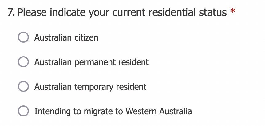 目前的居住身份(current residential status),包括澳洲公民、永久居民、臨時(shí)居民、有意向移民至西澳四個(gè)選項(xiàng)。