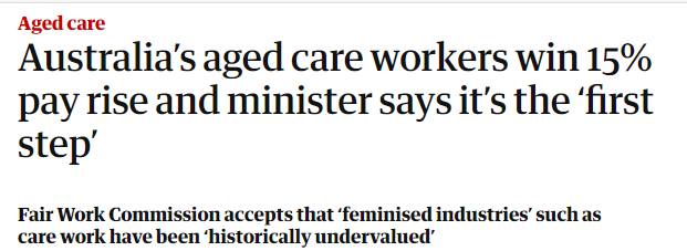 公平工作委員會FWC(Fair Work Commission)還表示,“女性化的行業”,如護理工作,在歷史上被低估了。