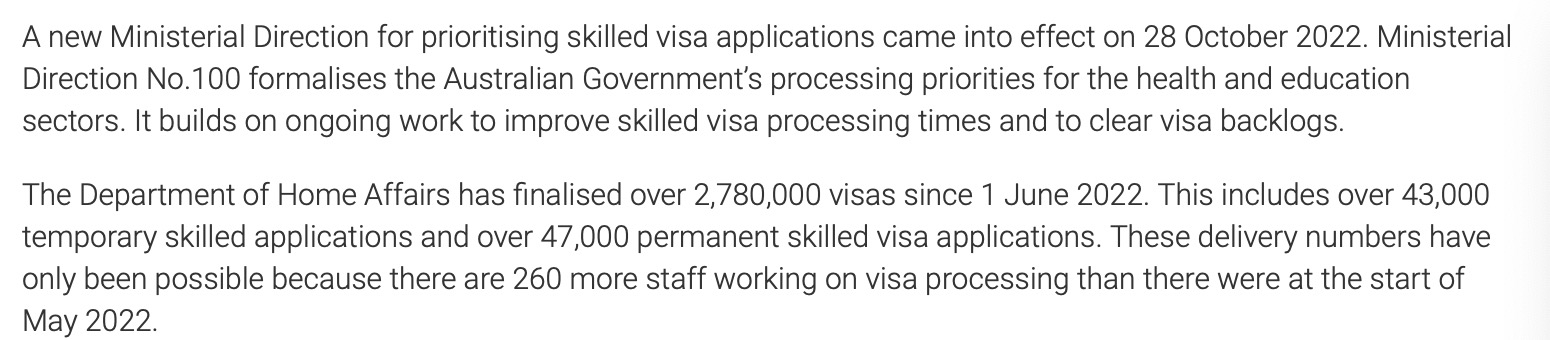 自2022年6月1日以來,內政部已經處理了超過278萬份簽證,其中包括超過43000個臨時技術簽證申請和超過47000個永久技術簽證申請。之所以能夠實現這些數字,是因為與2022年5月初相比,簽證處理工作人員增加了260人。