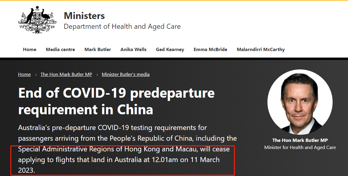 澳大利亞對(duì)來(lái)自中華人民共和國(guó)(包括香港和澳門特別行政區(qū)) 乘客的出發(fā)前COVID-19檢測(cè)要求將于2023年3月11日凌晨12點(diǎn)01分停止適用于降落在澳大利亞的航班。