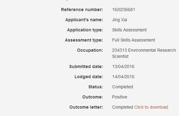 恭喜Jin Xiang通過VET評估!Environmental Research Scientist ANZSCO 234313,4月9日遞交,7月3日通過。