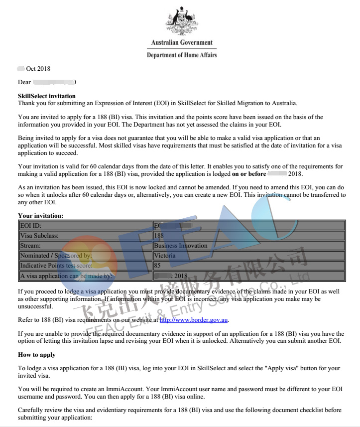 恭喜Mr.Zhao獲得188A維州州擔保并EOI獲邀!