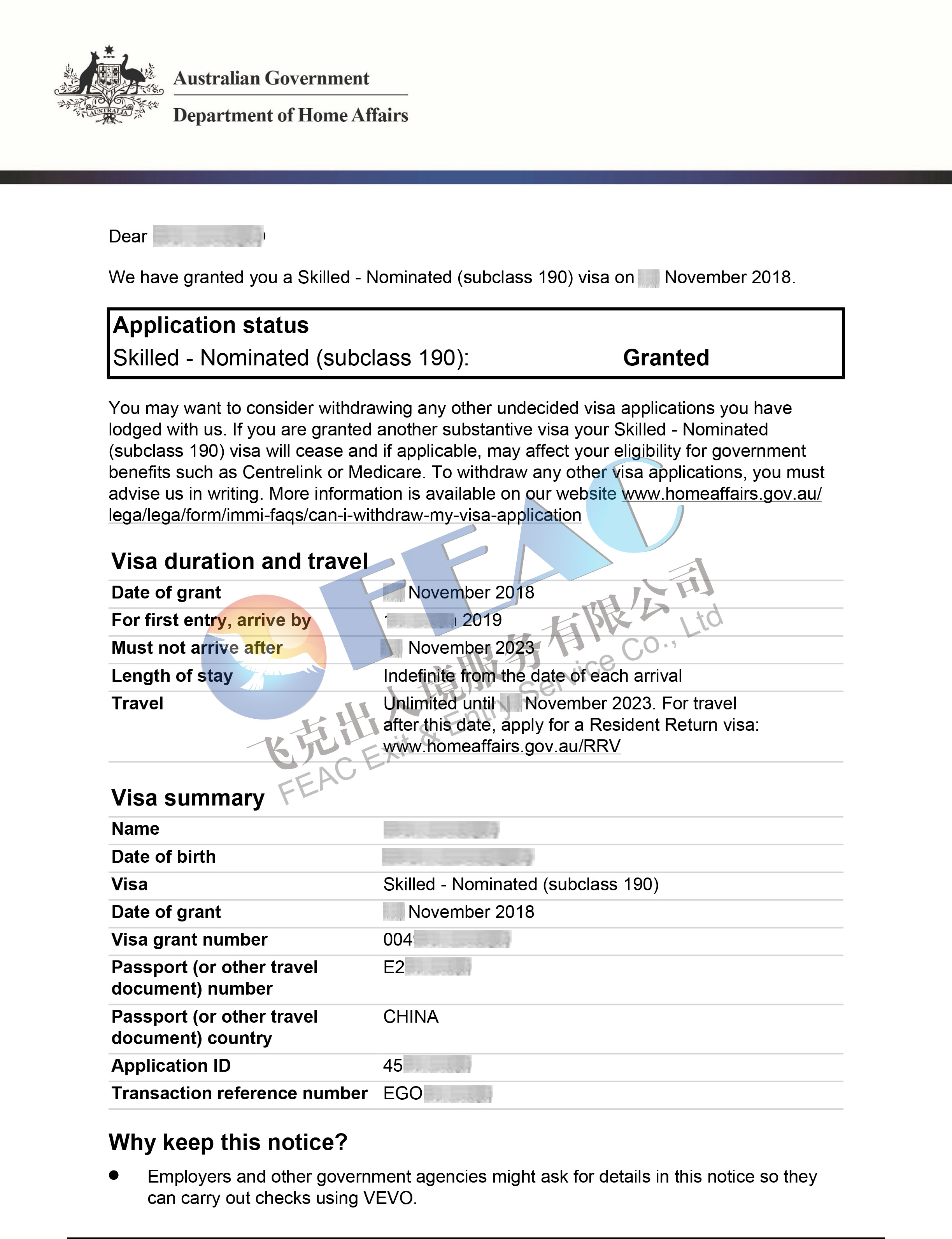 11月6日:恭喜Mr.Zhao 190簽證下簽(ANZSCO 233911)!