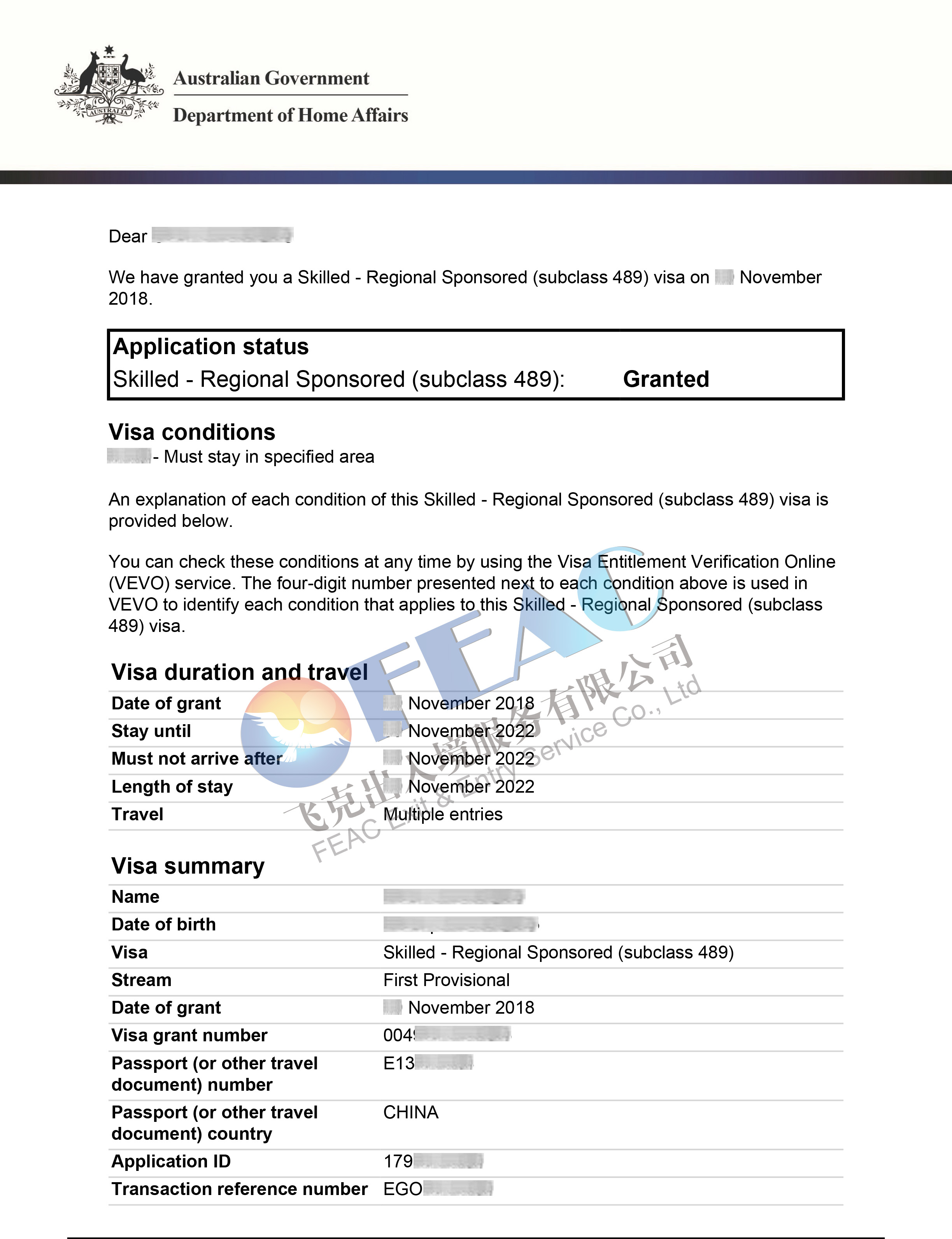2018年7月24日獲得昆州489擔(dān)保并EOI獲邀,8月20日遞交簽證材料,11月9日下簽。(移民分70分:基礎(chǔ)分60分+州擔(dān)保10分)