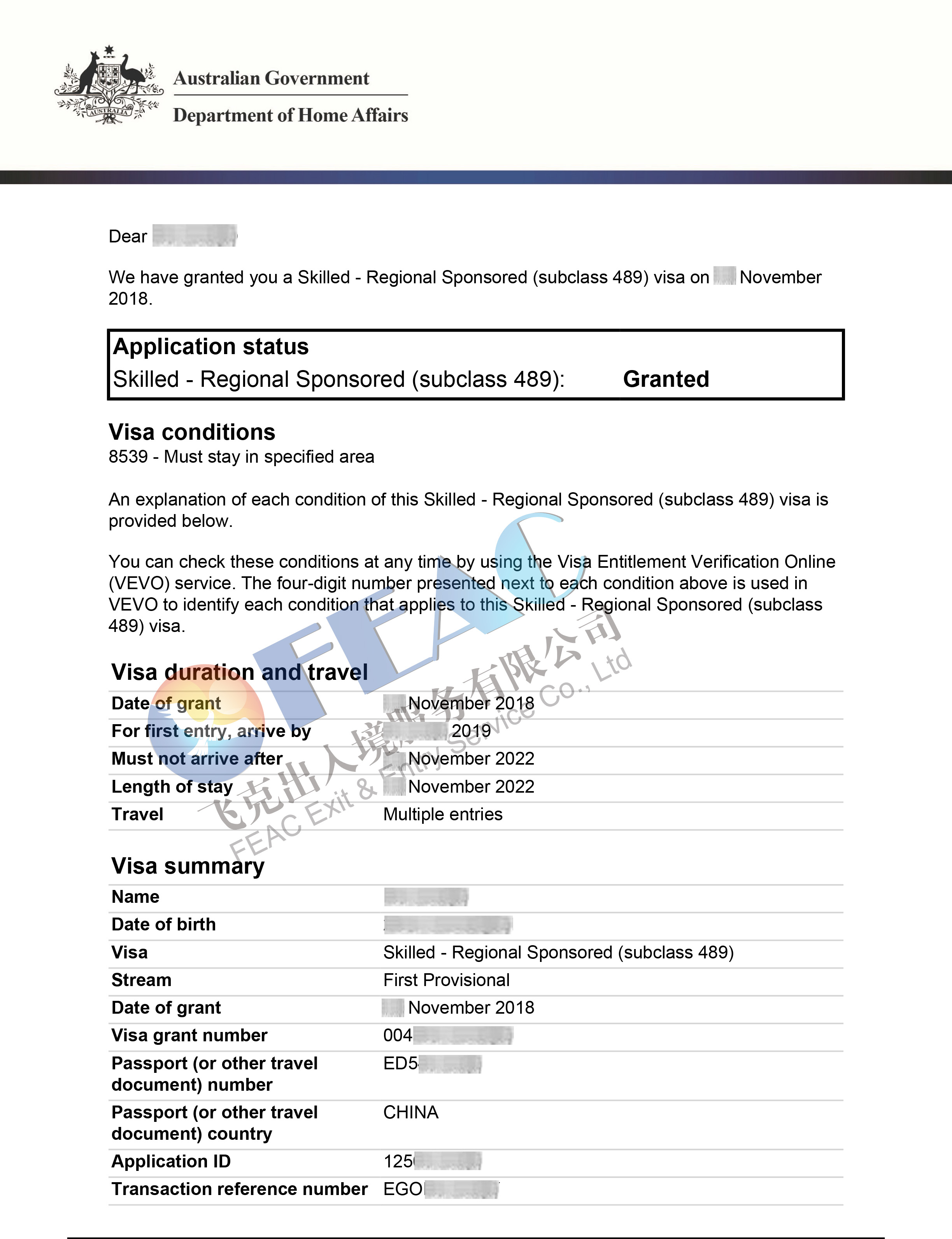 恭喜Ms.Luo南澳489簽證下簽!