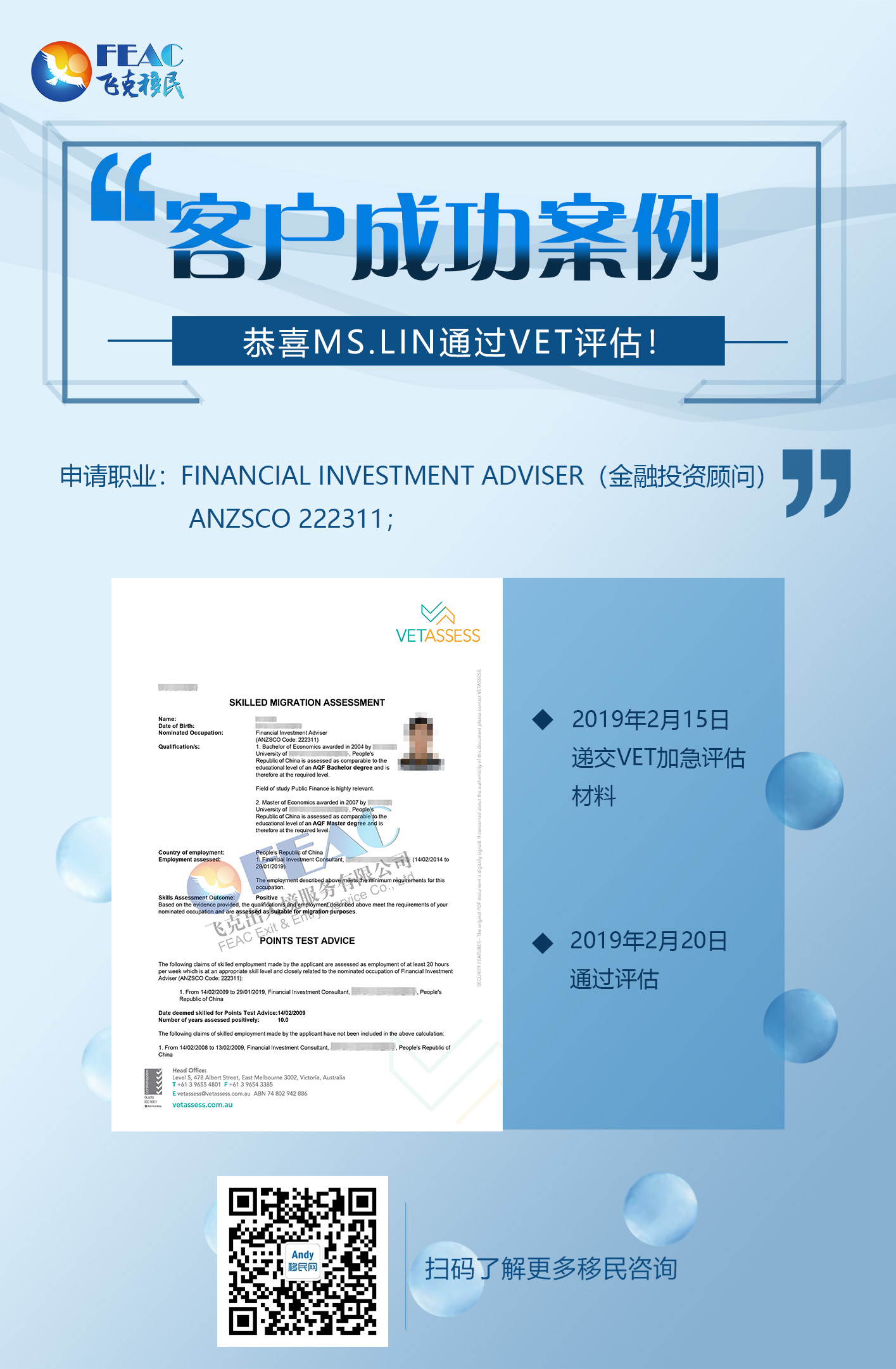 2月20日:恭喜Ms.Lin通過VET評估(ANZSCO 222311)!