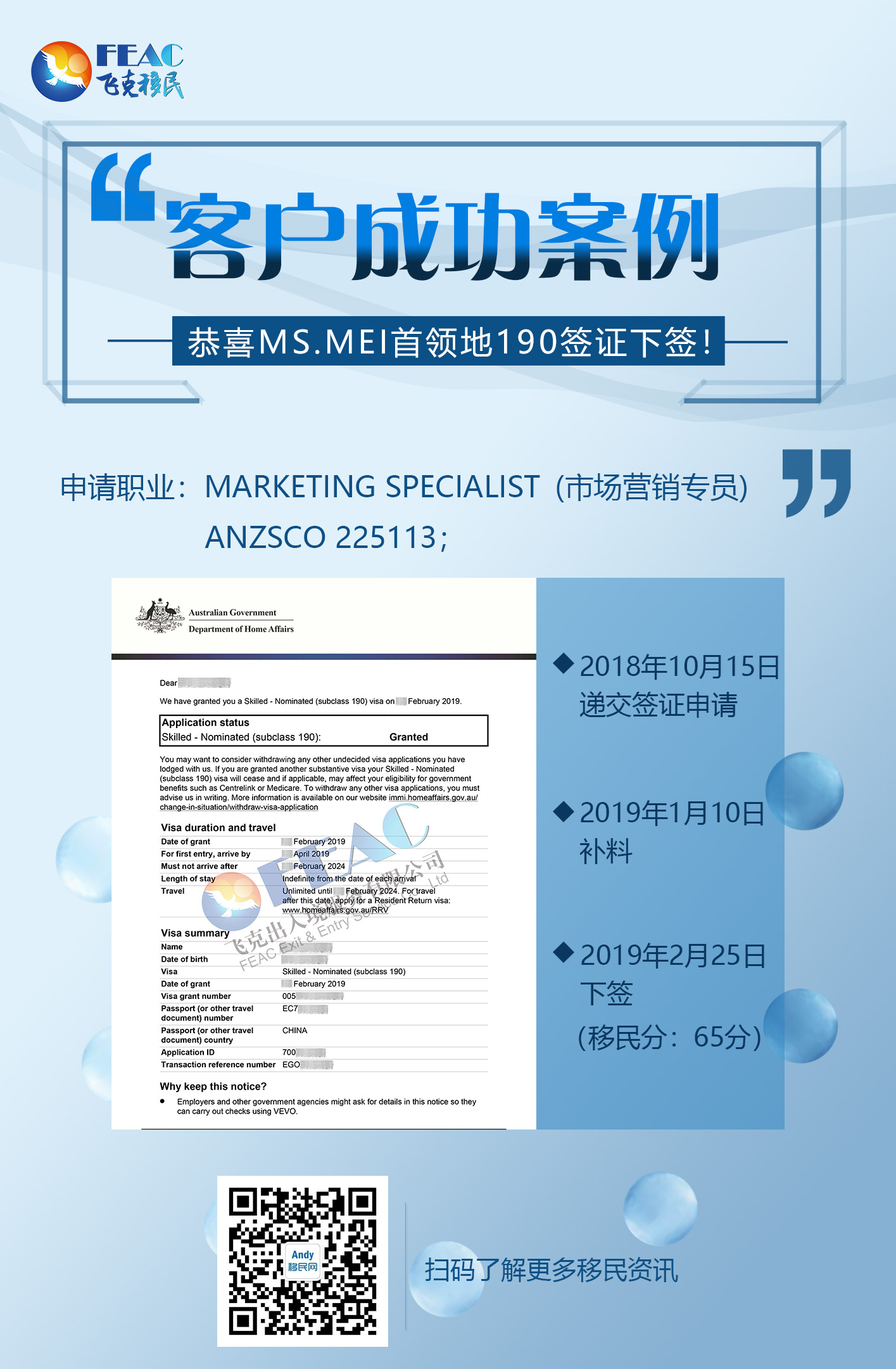 2月25日:恭喜Ms.Mei190簽證下簽(ANZSCO 225113)!