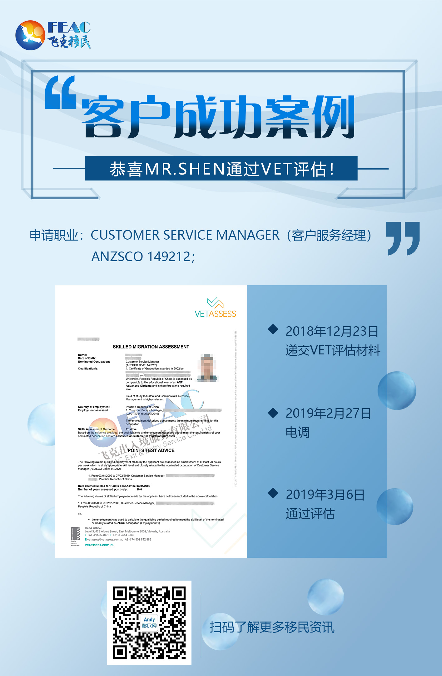 3月6日:恭喜Mr.Shen通過VET評估(ANZSCO 149212)!