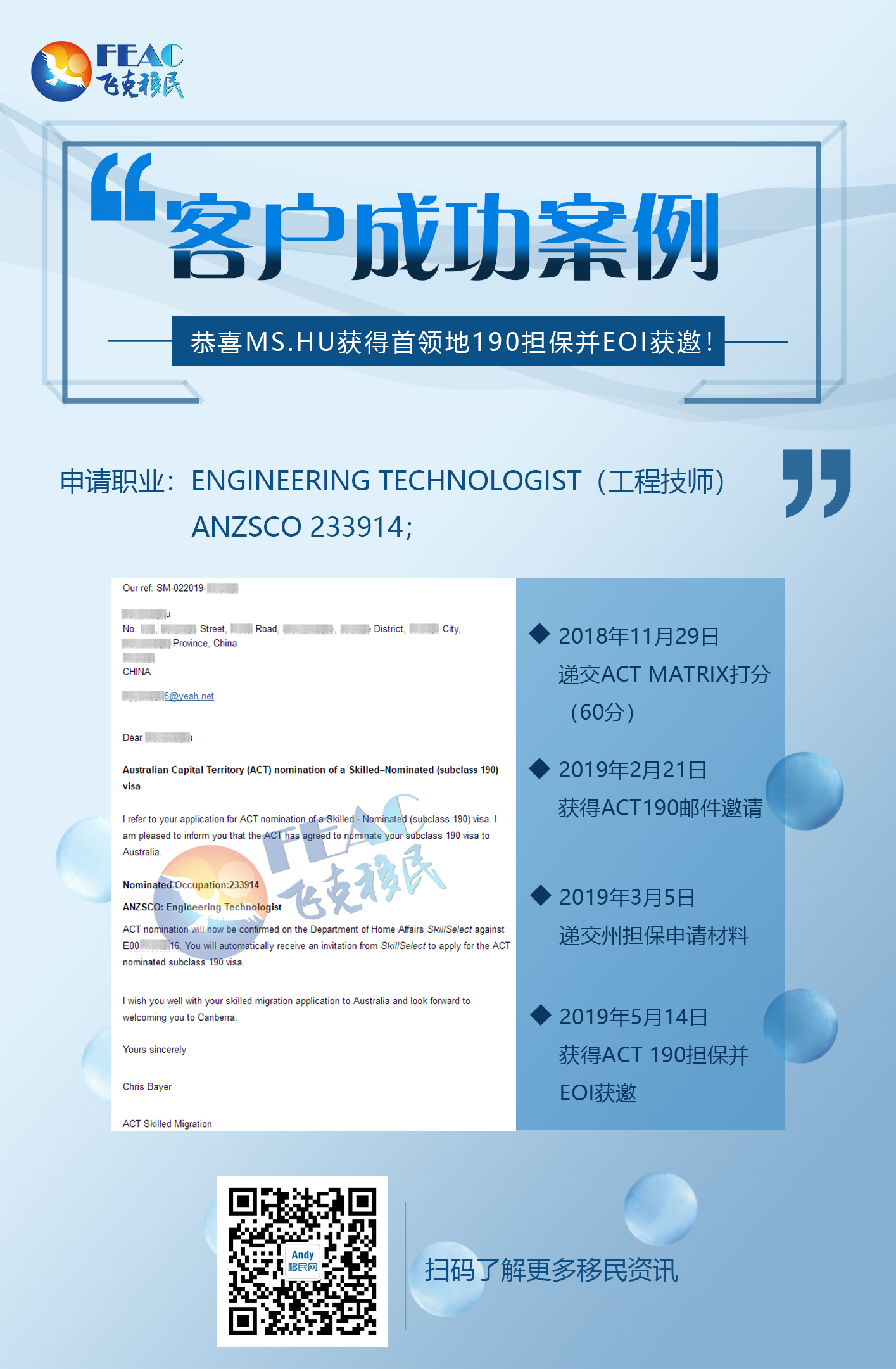 2018年11月29日遞交ACT Matrix打分(60分),2019年2月21日獲得ACT 190郵件邀請,2019年3月5日遞交州擔保申請材料,2019年5月14日獲得ACT 190擔保并EOI獲邀。