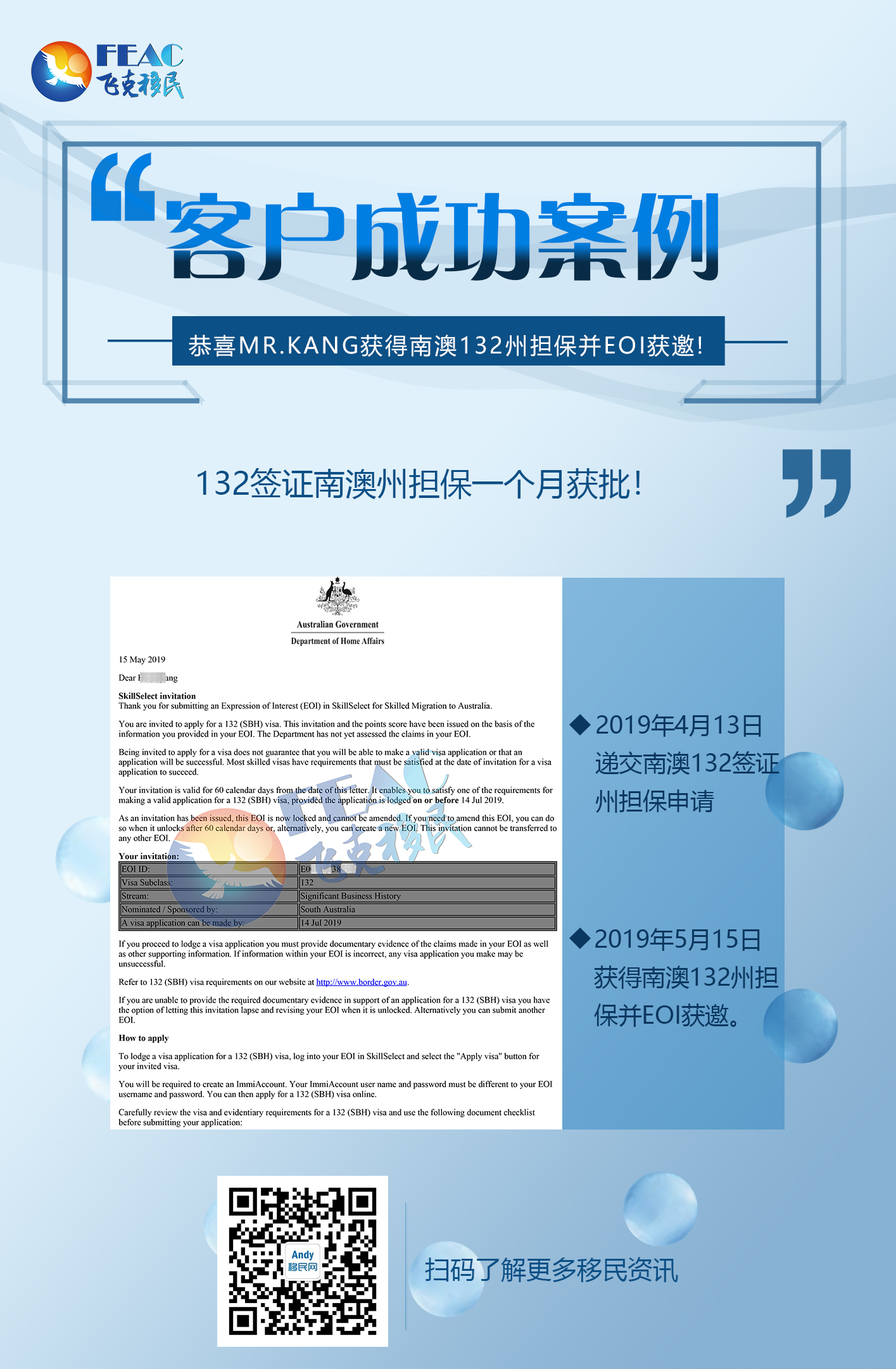 5月15日:恭喜Mr.Kang獲得南澳132州擔保并EOI獲邀!