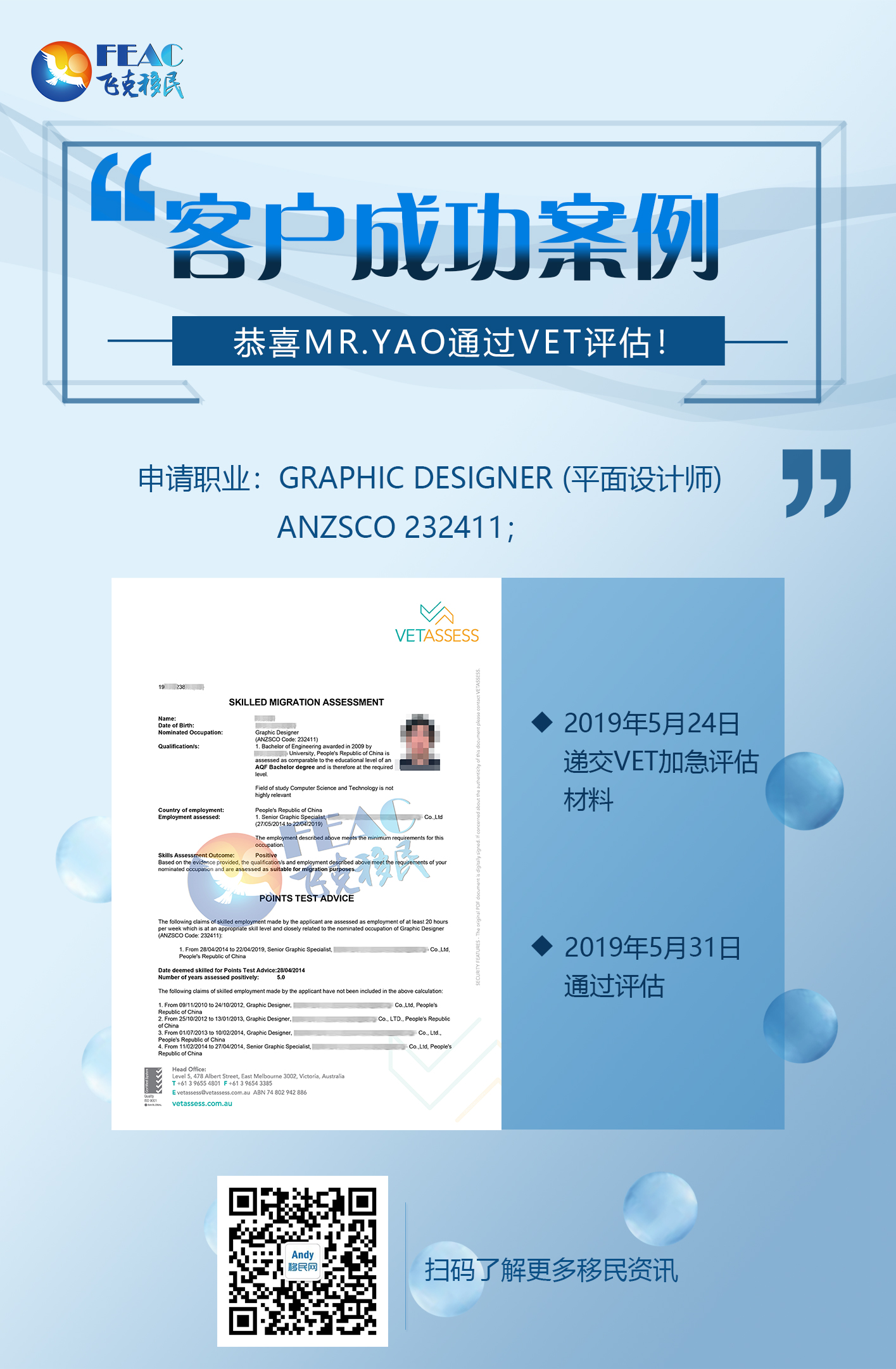 5月31日:恭喜Mr.Yao通過VET評估(ANZSCO 232411)!
