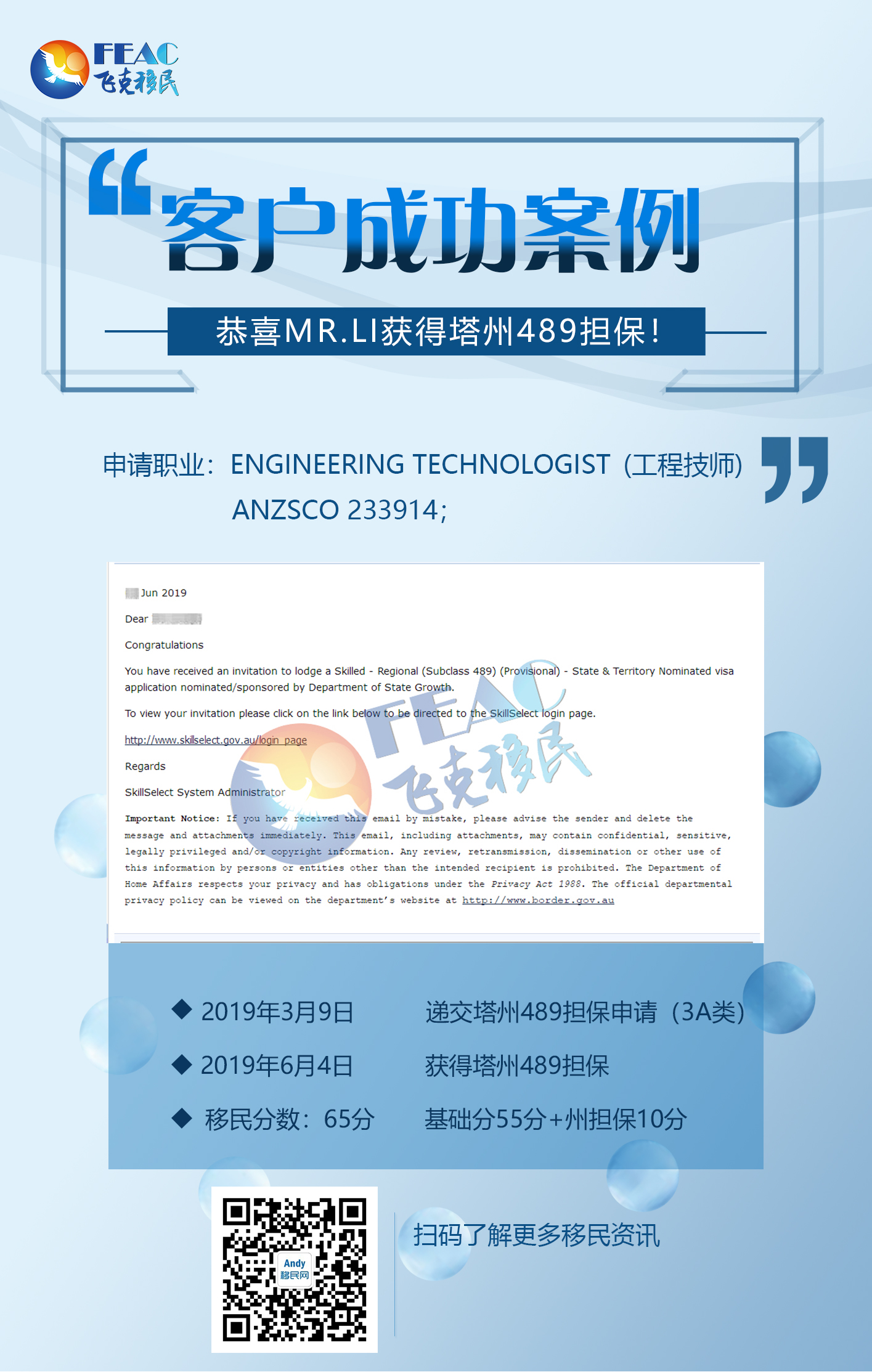 6月4日:恭喜Mr.Li獲得塔州489擔保(ANZSCO 233914)!
