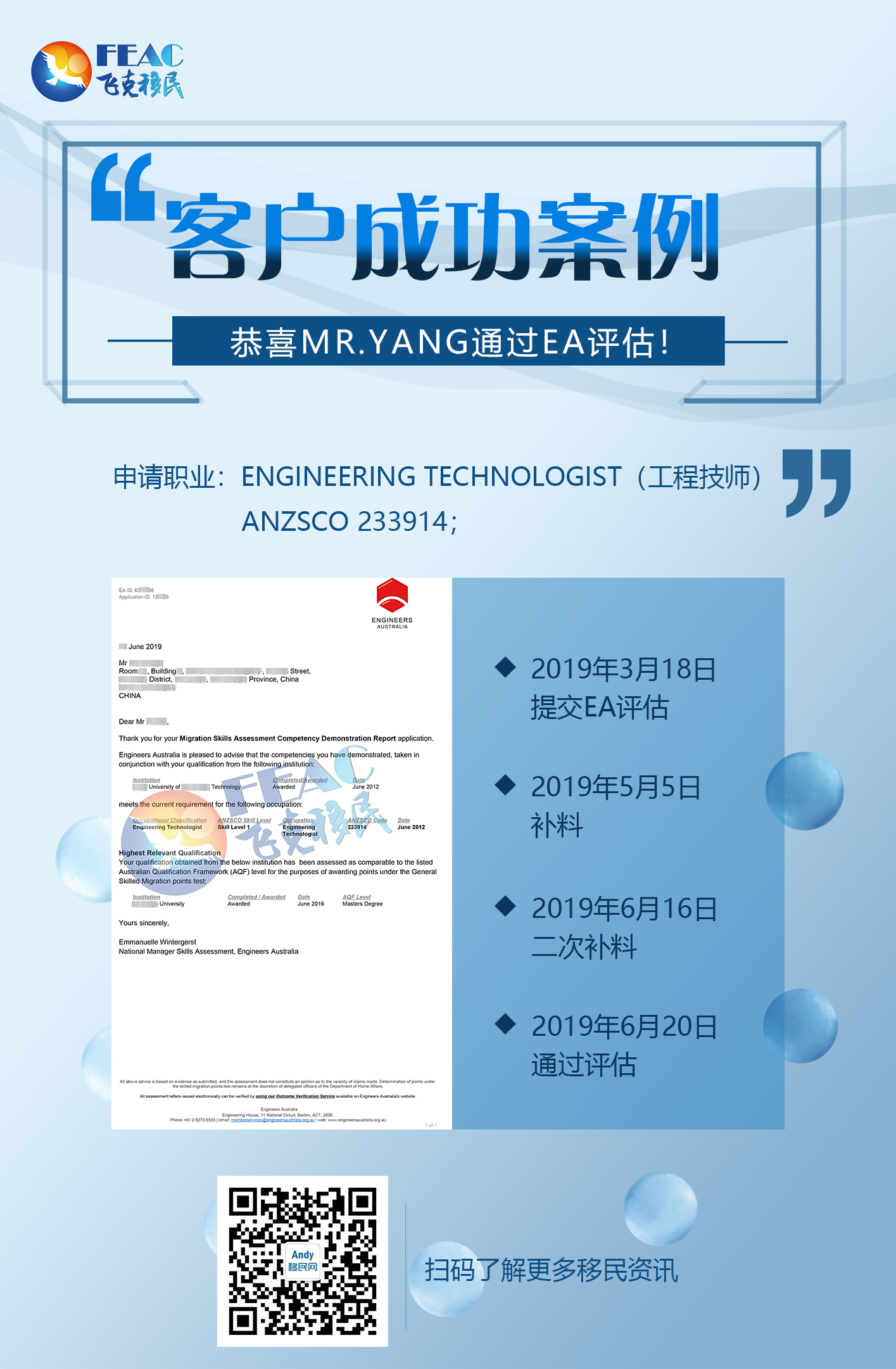 6月20日:恭喜Mr.Yang通過(guò)EA評(píng)估(ANZSCO 233914)!
