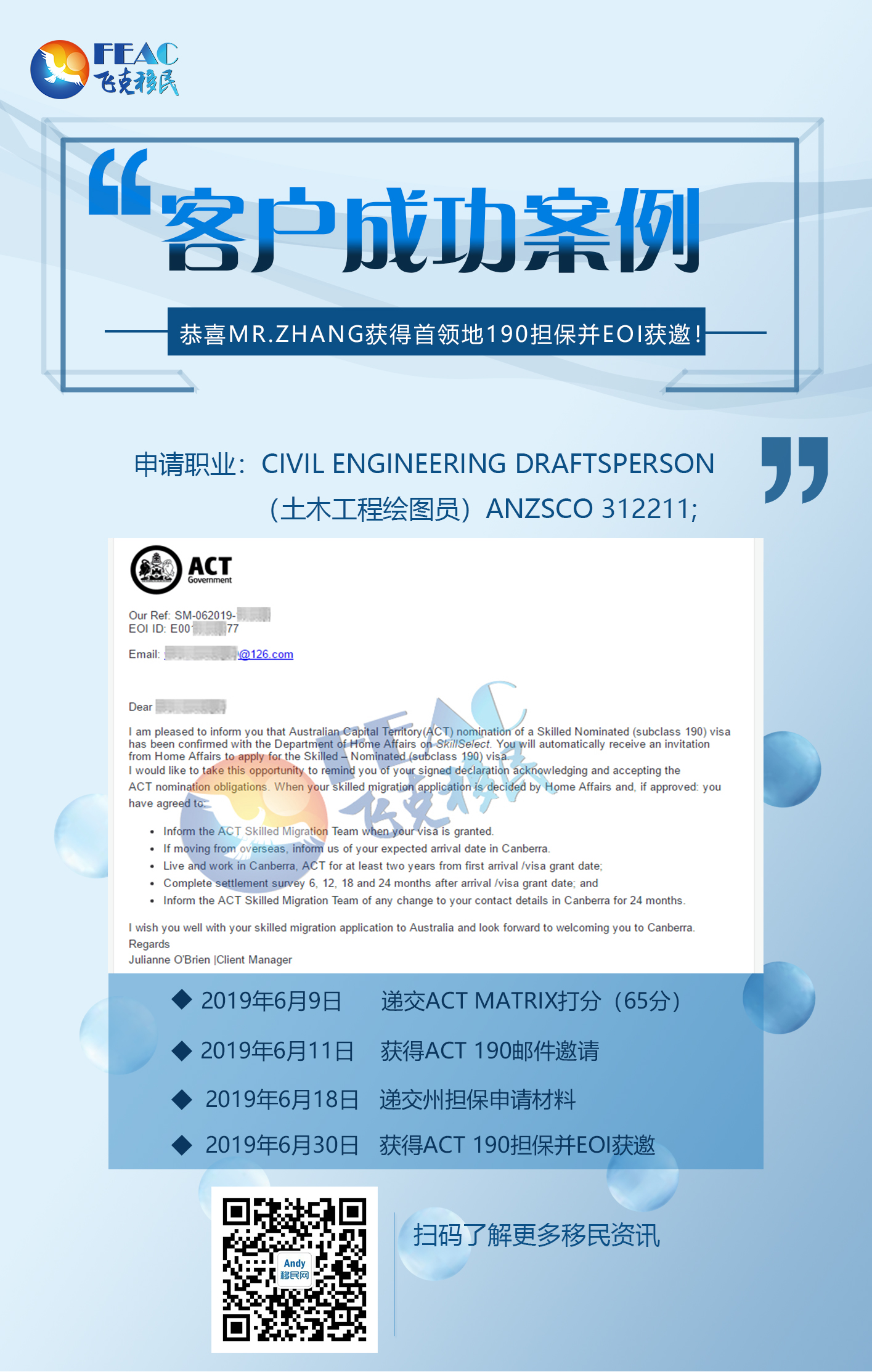 2019年6月9日遞交ACT Matrix打分(65分),2019年6月11日獲得ACT 190郵件邀請,2019年6月18日遞交州擔(dān)保申請材料,2019年6月30日獲得ACT 190擔(dān)保并EOI獲邀。