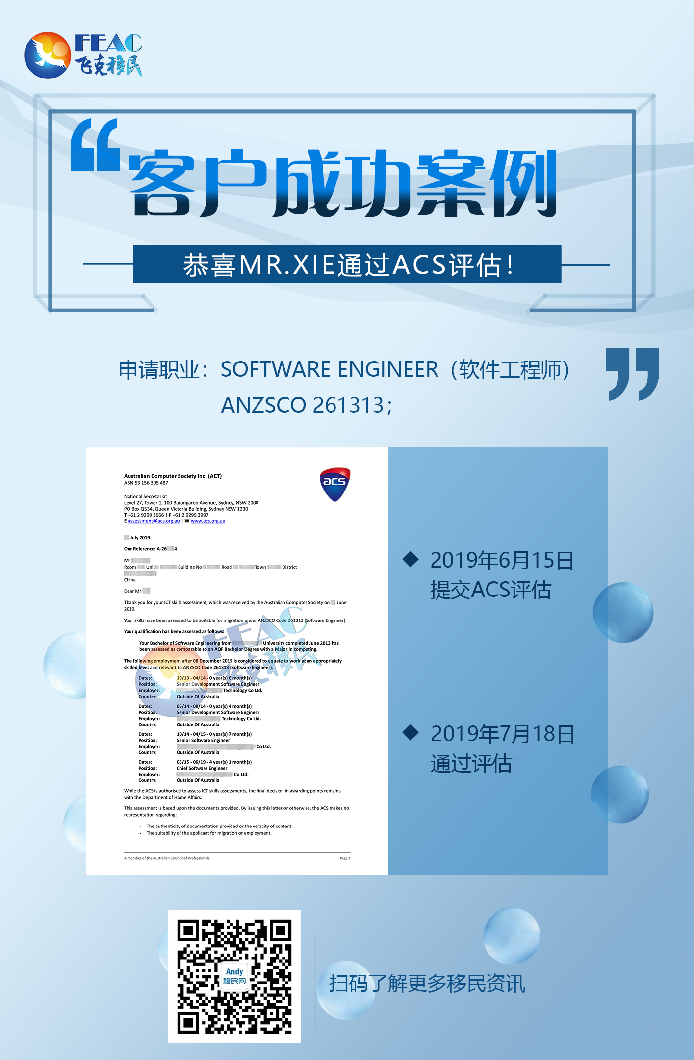 7月18日:恭喜Mr.Xie通過(guò)ACS評(píng)估(ANZSCO 261313)!