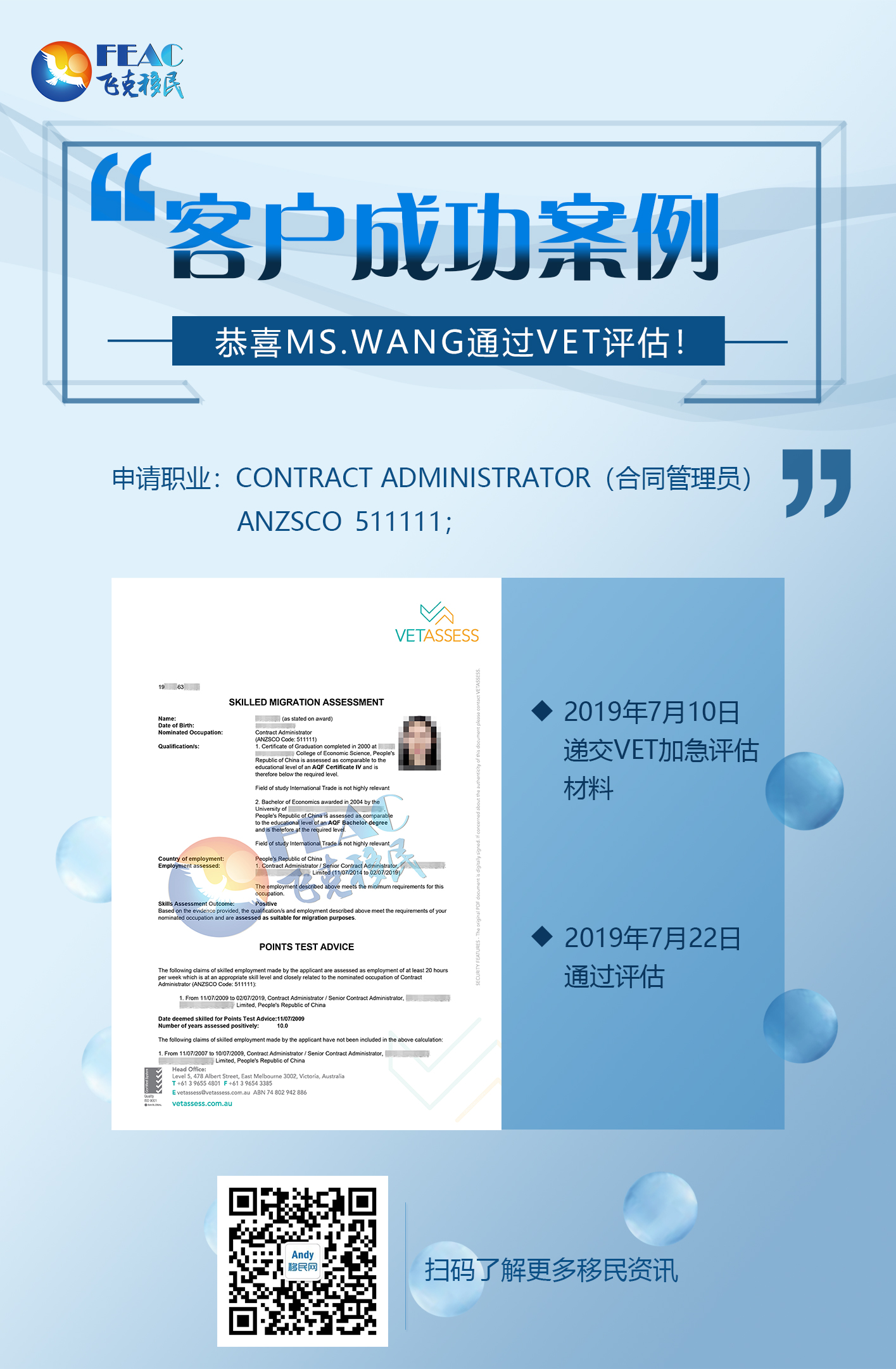 7月22日:恭喜Ms.Wang通過VET評估(ANZSCO 511111)!