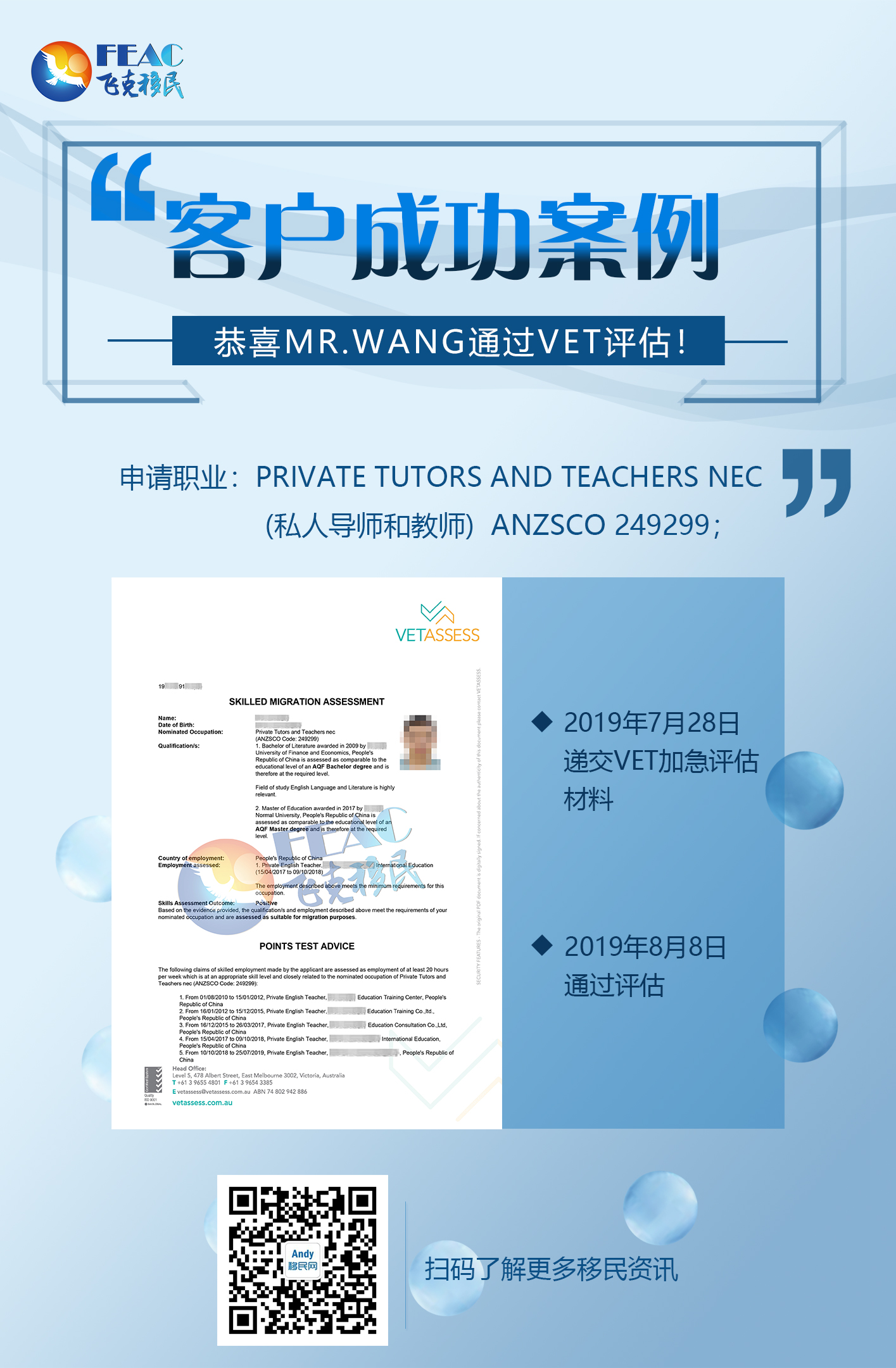 8月8日:恭喜Mr.Wang通過VET評估(私人導(dǎo)師和教師)!