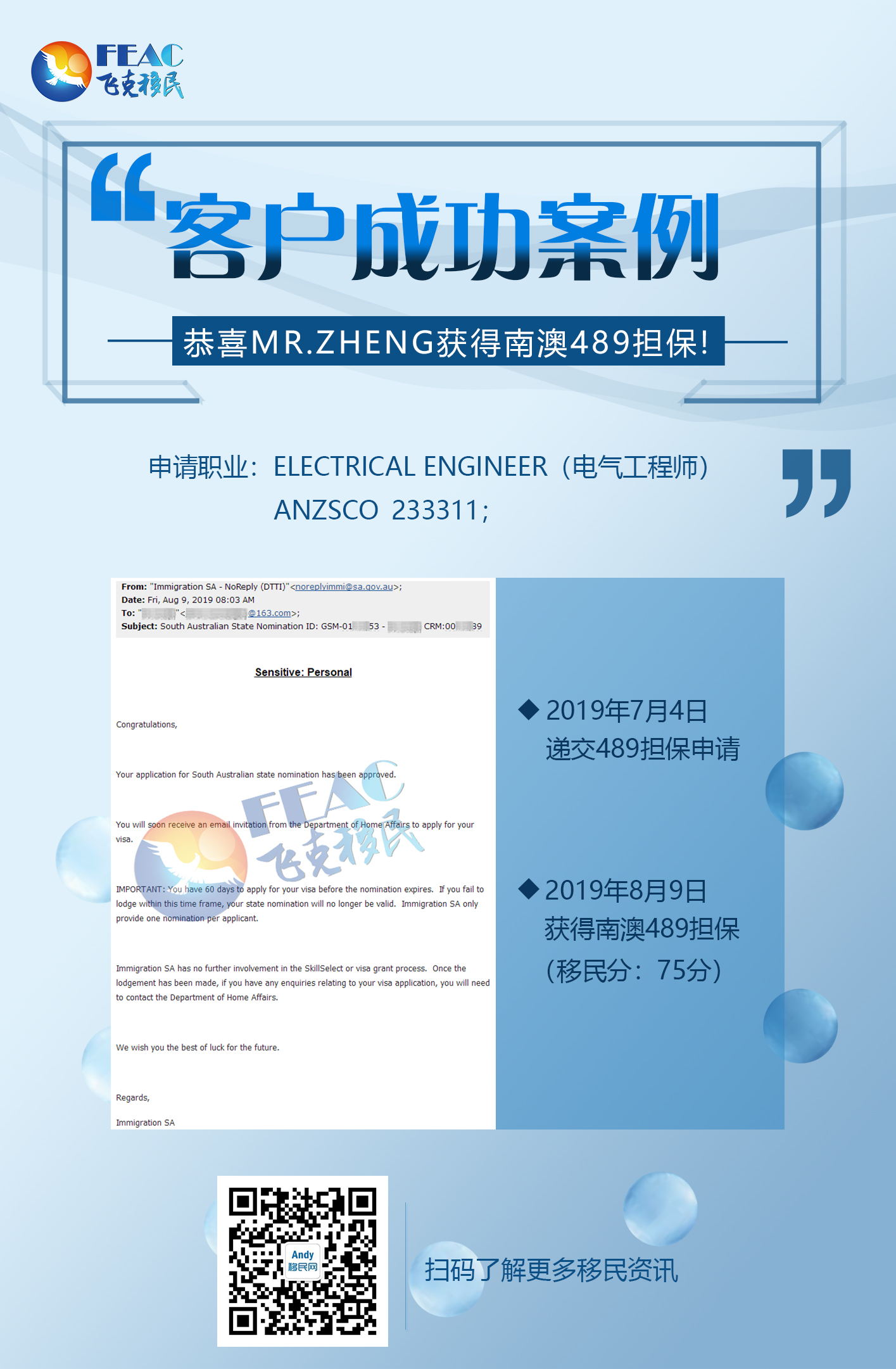 8月9日:恭喜Mr.Zheng獲得南澳489擔保(電氣工程師)!
