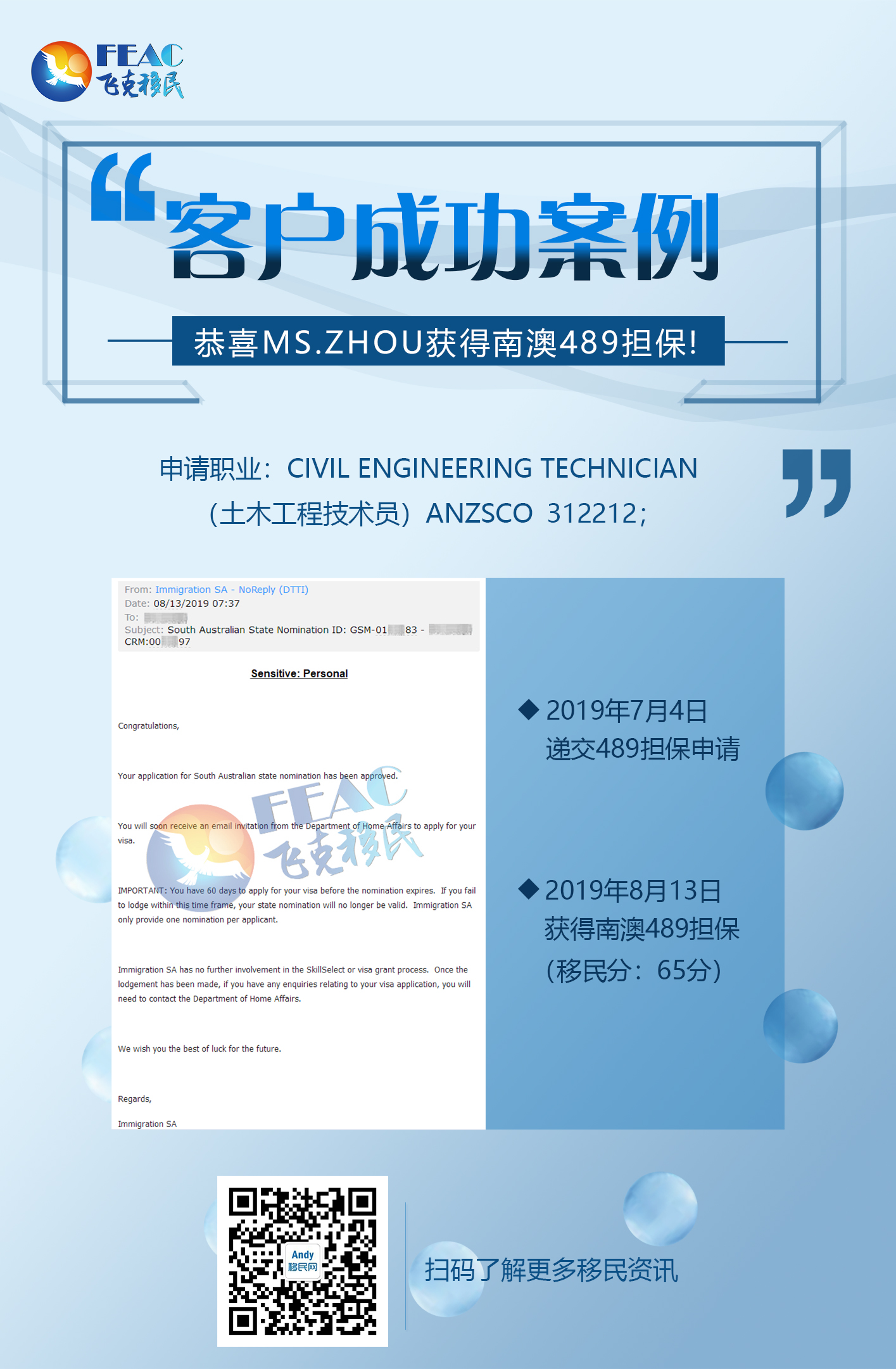8月13日:恭喜Ms.Zhou獲得南澳489擔保(土木工程技術員)!