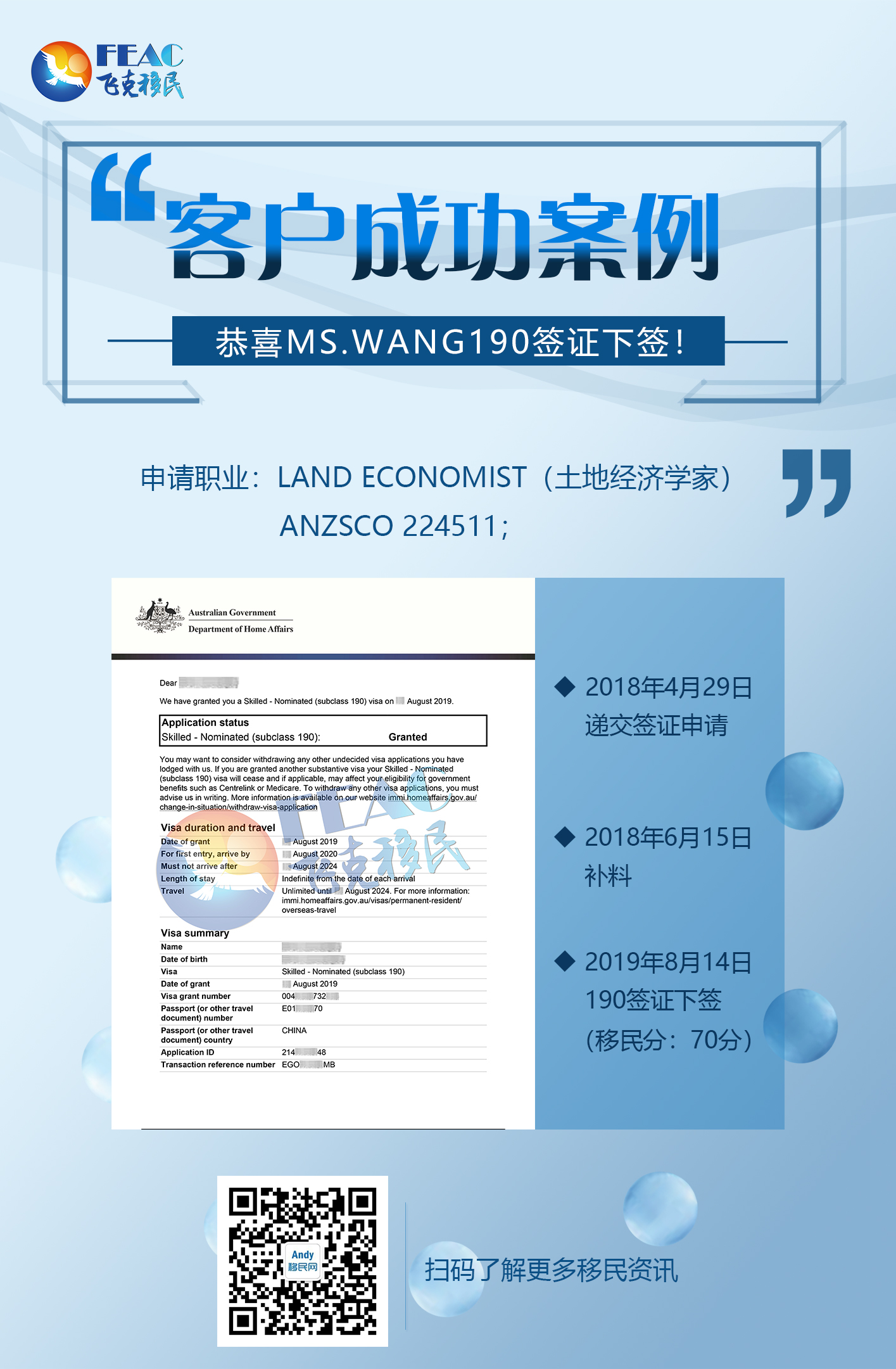 8月14日:恭喜Ms.Wang190簽證下簽 (土地經(jīng)濟(jì)學(xué)家)!