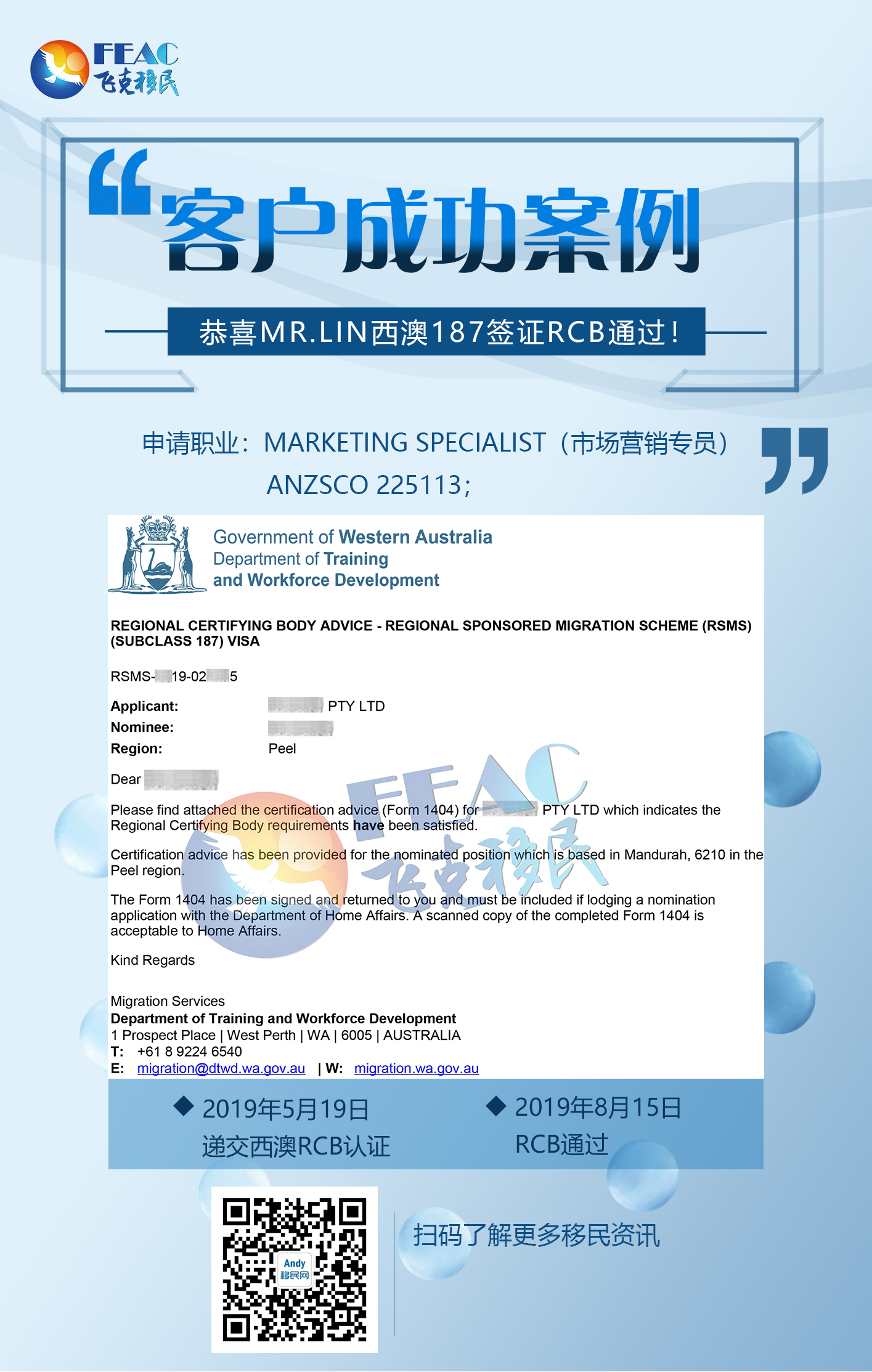 8月15日:恭喜Mr.Lin西澳187簽證RCB通過(guò)(市場(chǎng)營(yíng)銷(xiāo)專(zhuān)員)!