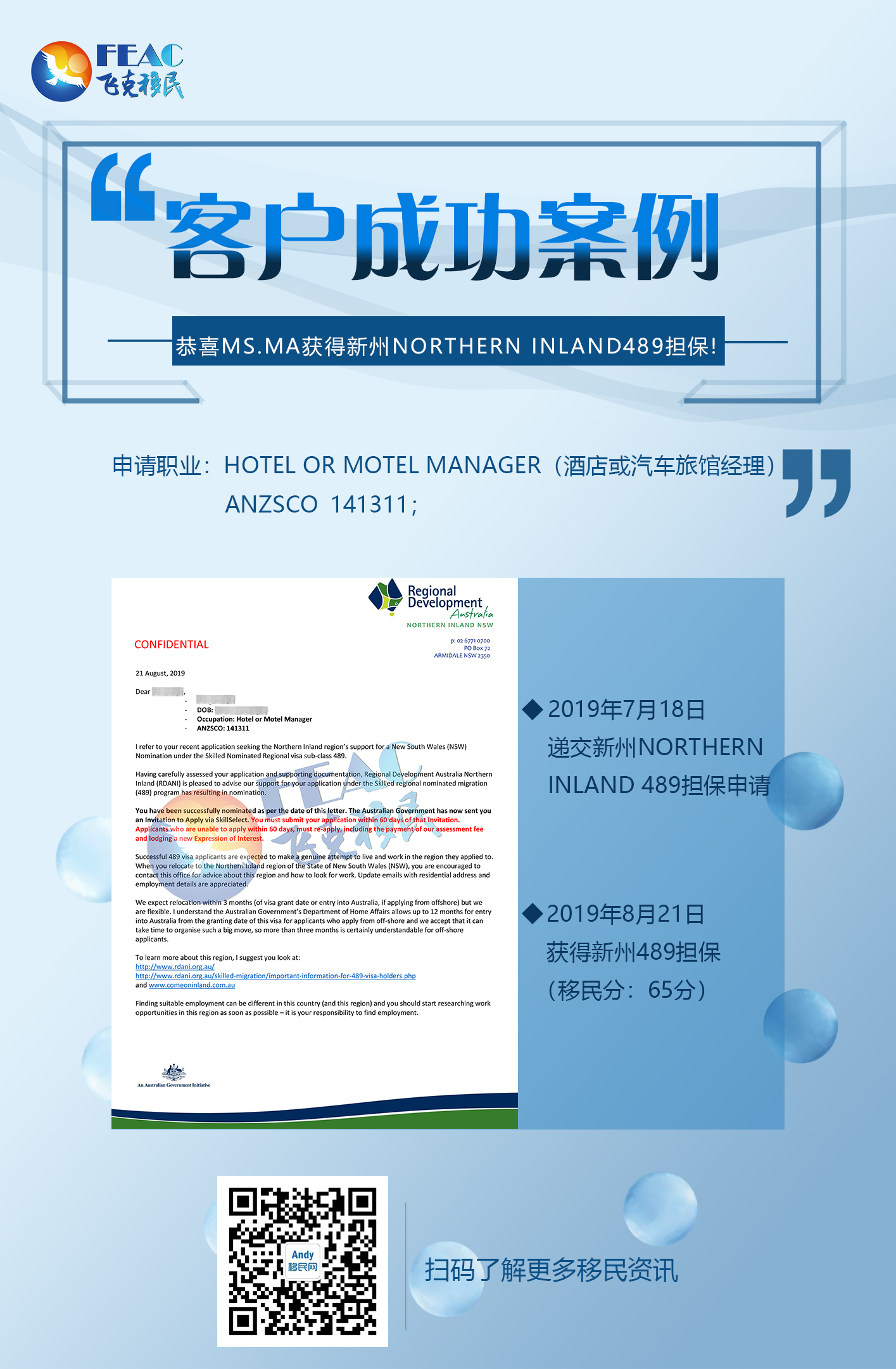 2019年7月18日遞交新州Northern Inland 489擔保申請,2019年8月21日獲得新州489擔保。(移民分65分:基礎分55分+州擔保10分)