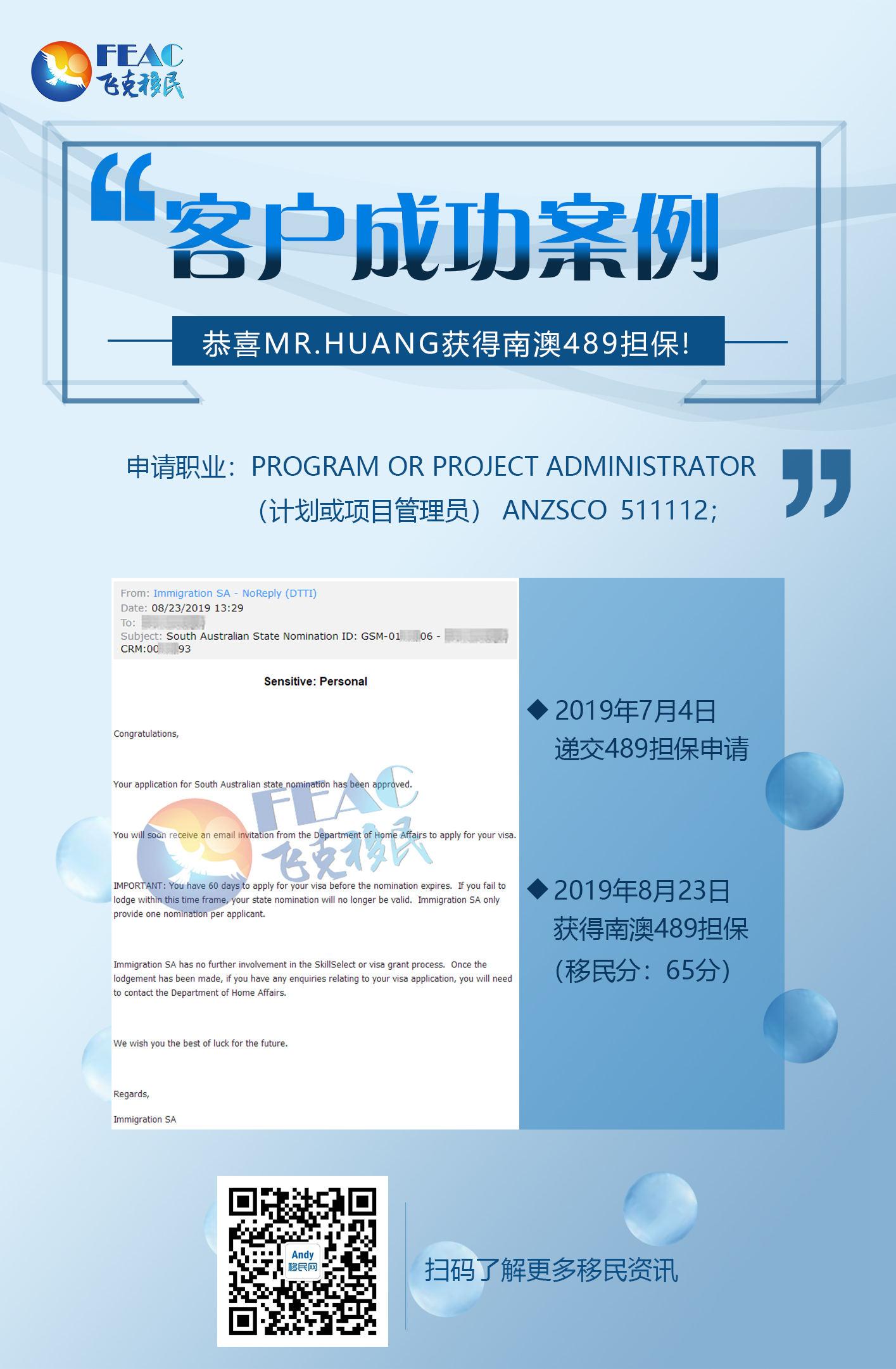 2019年7月4日遞交南澳489擔保申請,2019年8月23日獲得南澳489擔保!(移民分65分:基礎分55分+州擔保10分)