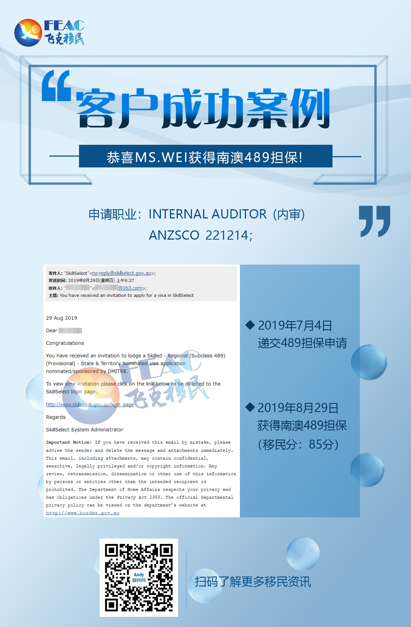 8月29日:恭喜Ms.Wei獲得南澳489擔(dān)保(內(nèi)審)!