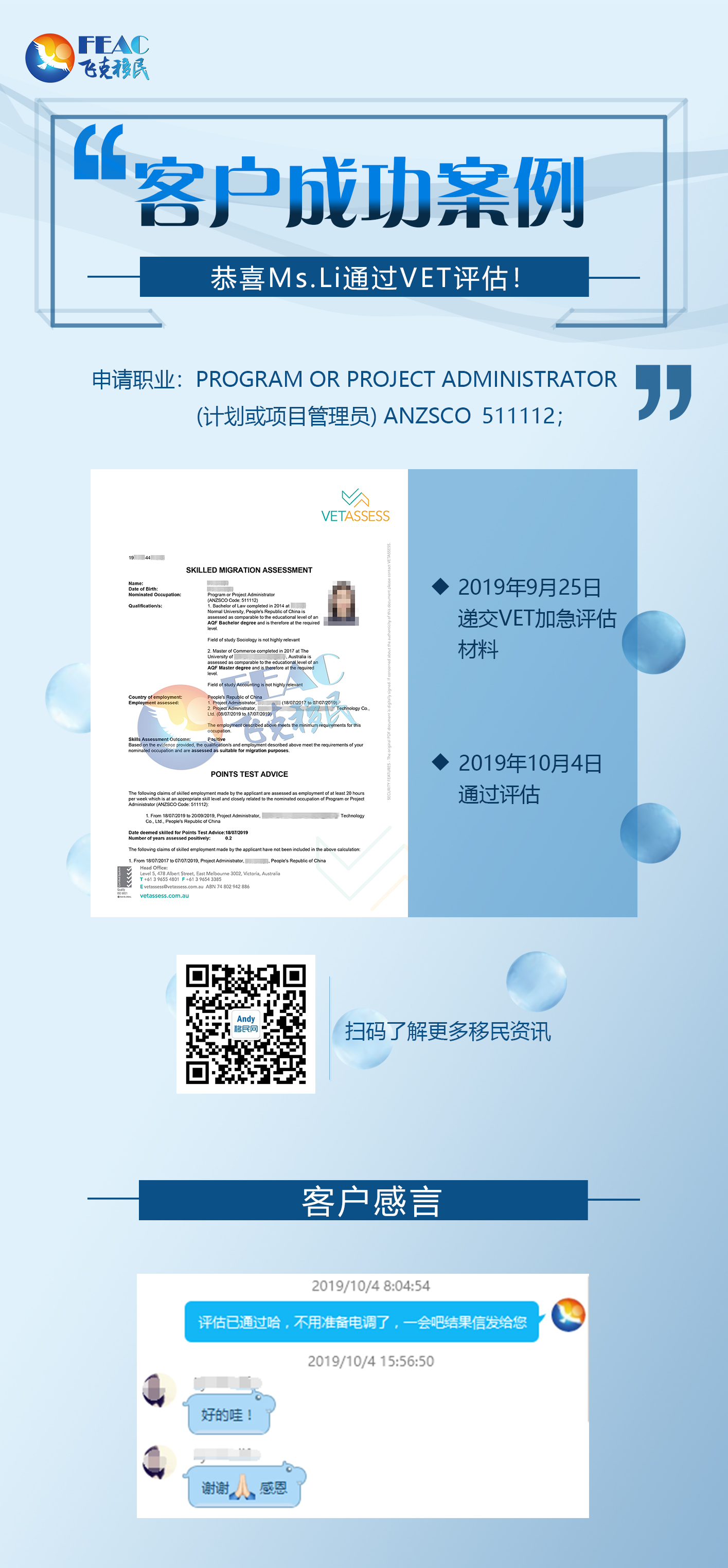 10月4日:恭喜Ms.Li通過VET評估(計劃或項目管理員)!