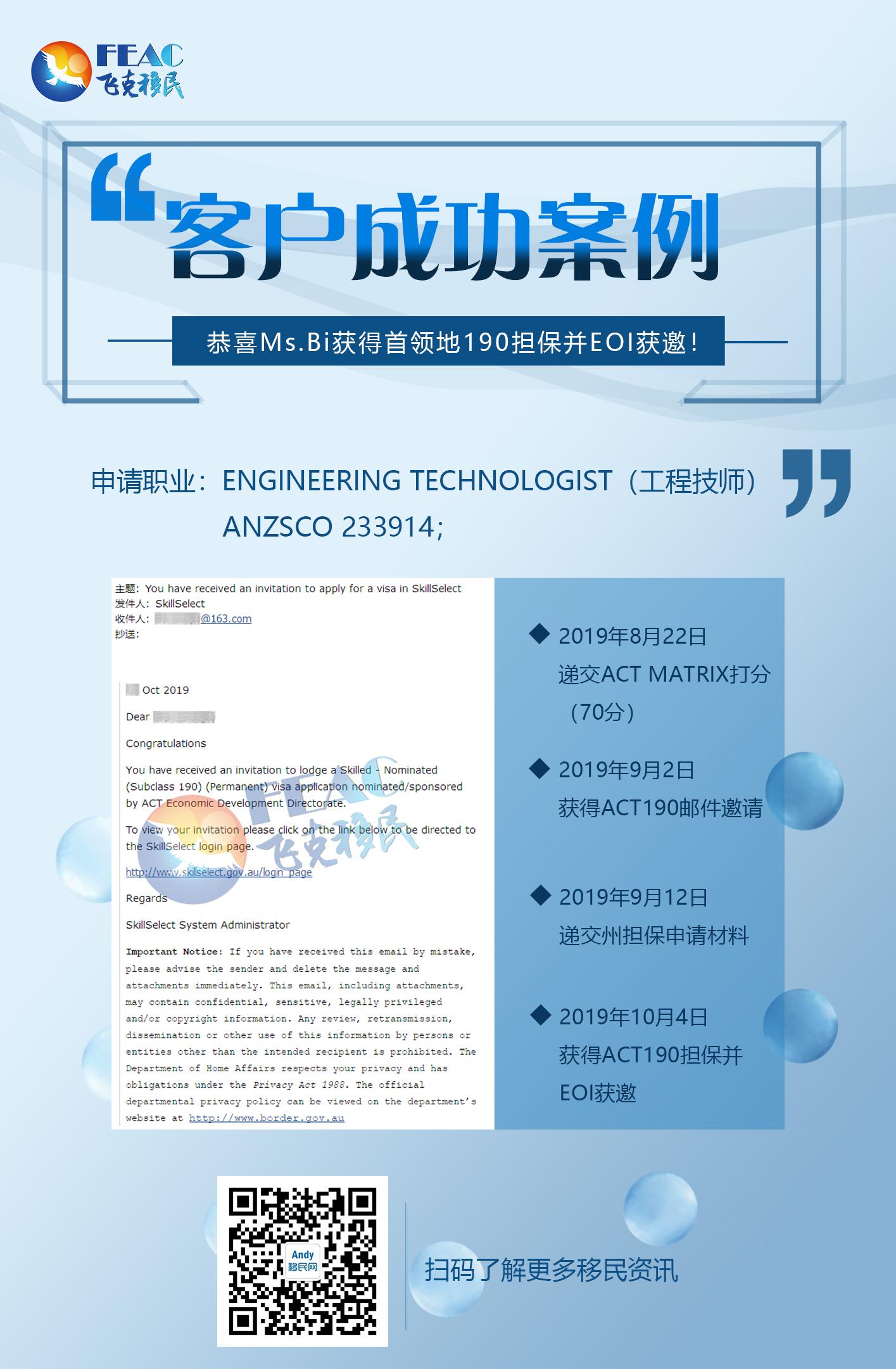2019年8月22日遞交ACT Matrix打分(70分),2019年9月2日獲得ACT 190郵件邀請,2019年9月12日遞交州擔(dān)保申請材料,2019年10月4日獲得ACT 190擔(dān)保并EOI獲邀。