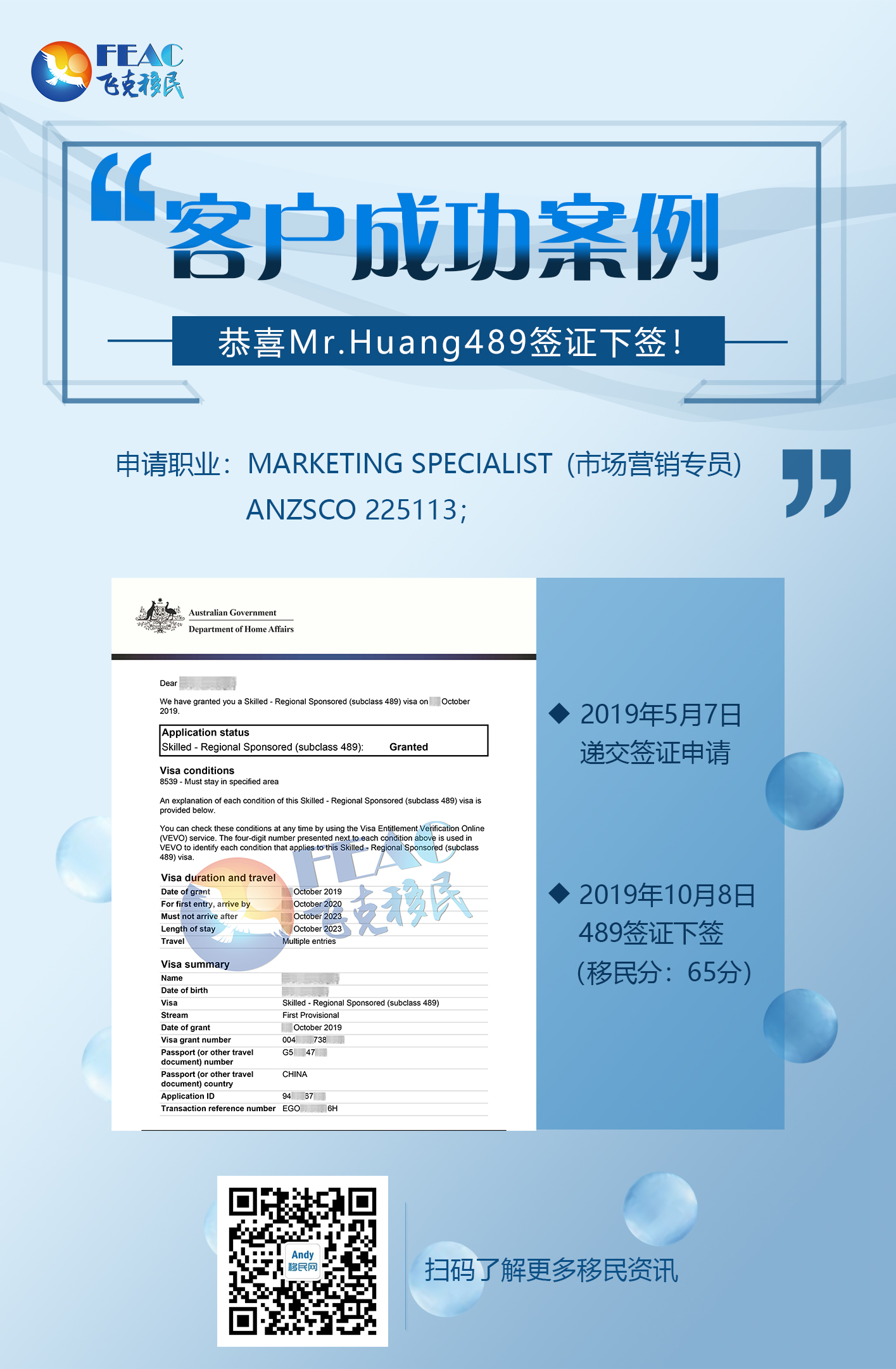 10月8日:恭喜Mr.Huang489簽證下簽 (市場營銷專員)!